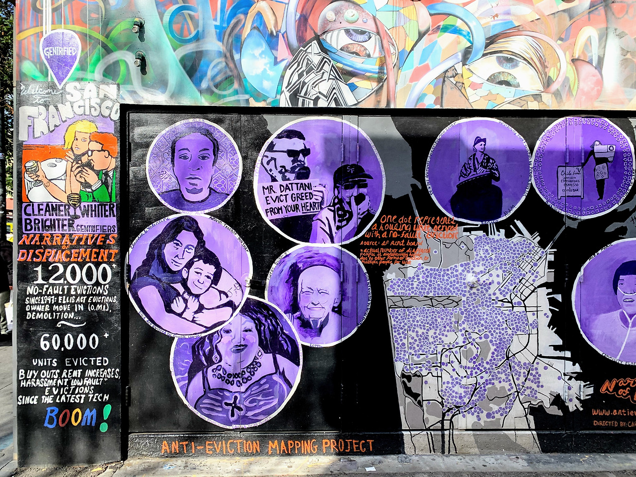 샌프란시스코의 저항문화가 어느 시점에서 하이트에서 미션으로 옮겨 갔다고 한다. 마크 저커버그 저택이 있는 도로레스 공원과 한국에 진출한 타르틴 베이커리의 본점이 있는 곳이다. 저항문화의 전통을 피부로 느낄 수 있는 클래리언 앨리 뮤럴 프로젝트다. 비자발적으로 퇴출된 세입자 실태를 묘사한 벽화다. 과연 샌프란시스코는 지속 가능한 도시일까.