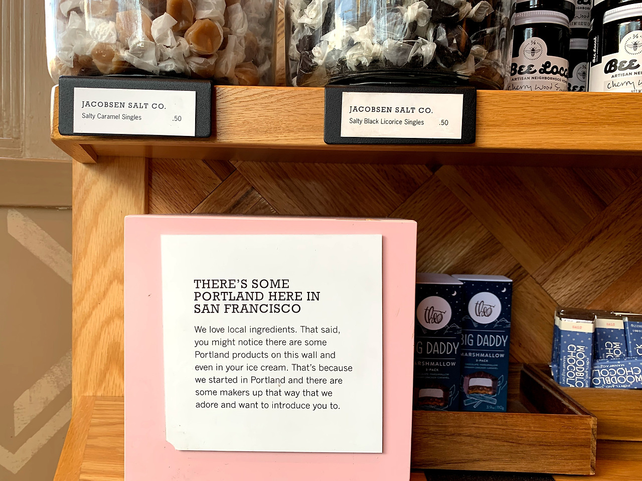 로컬 브랜드의 확장. 자존심 강한 팰로앨토 중심가에 진출한 포틀랜드 아이스크림 브랜드 Salt & Straw 매장이다. 아쉽게도 매장 어느 곳에서도 포틀랜드 출신임을 언급하지 않는다. 협력업체 상품을 소개할 때 포틀랜드 단어가 나오는데 잘 모르는 사람은 이것으로 브랜드의 고향이 포틀랜드인 것을 추측하기 어렵다. 그래도 포틀랜드 브랜드니까 고향을 완전히 무시하지 않는다고 스스로를 위로한다.