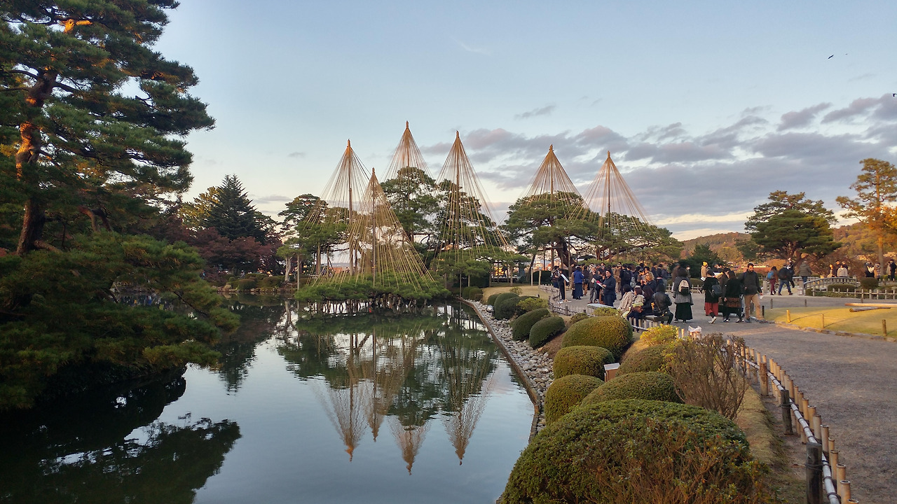 복원된 가나자와 성 앞에는 일본 3대 정원 중 하나인 겐로쿠엔兼六園이 있다. 마에다 가문이 오랫동안 가꾼 공간이다. 1874년부터 대중에 개방된 겐로쿠엔의 유명한 다리를 건너면 가나자와 성의 정문이 나온다. 정문은 가나자와 성에 속한 건물 중에서 유일하게 원형을 유지하면서 자리를 지킨 건물이다. 제1관문을 통과하면 사방이 성벽으로 둘러싸인 공터가 나오고 그 오른쪽에 성 안으로 들어가는 제2관문이 있다. 제2관문을 통과하면 비로소 거대한 성 안의 풍경이 눈앞에 펼쳐진다. 엄청난 규모의 성은 과거 마에다 가문의 위용을 짐작하게 한다.