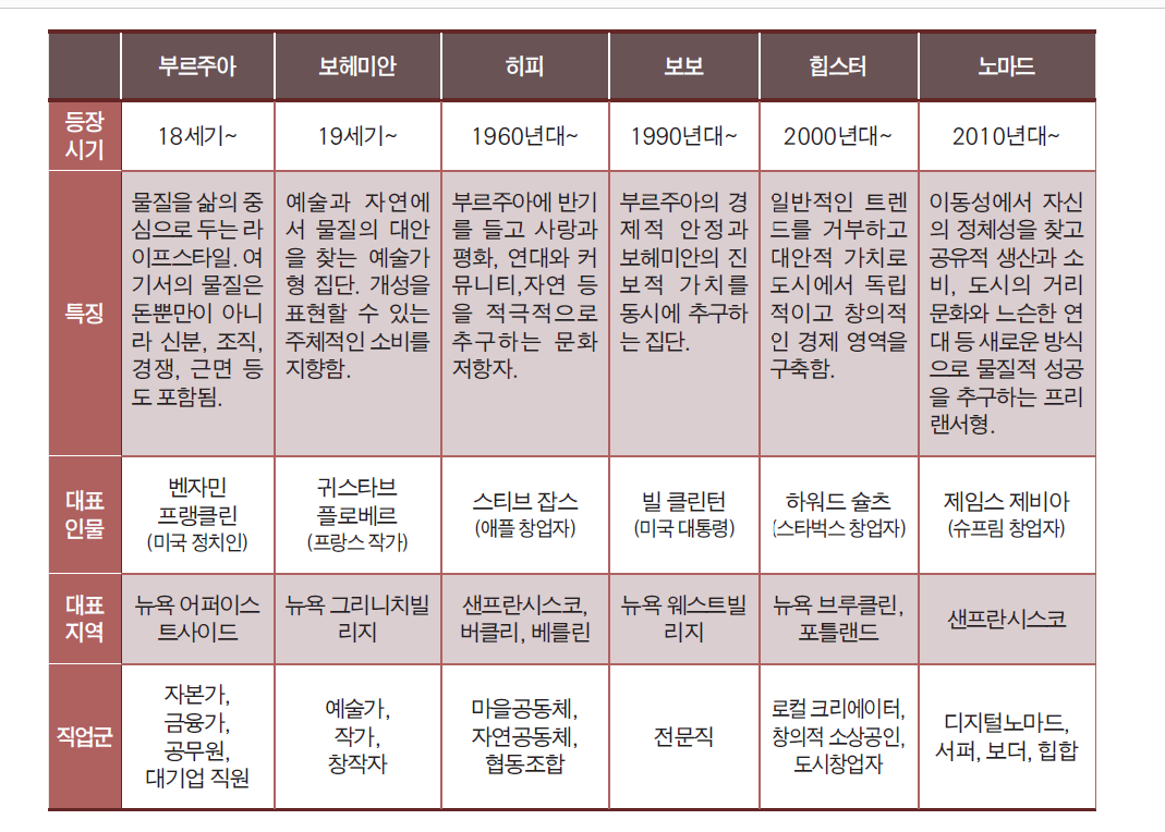 서구 역사를 살펴보면 탈물질주의 안에 예술가 보헤미안, 문화 저항자 히피, 진보 기업가 보보, 로컬 크리에이터 힙스터, 프리랜서 노마드 등 다양한 라이프스타일 모델이 존재함을 발견할 수 있다. 본 책에서는 라이프스타일 역사를 기반으로 물질과의 독립성과 추구하는 탈물질주의 가치에 따라 부르주아, 보헤미안, 히피, 보보, 힙스터, 노마드 등 6개 유형으로 분류한다.