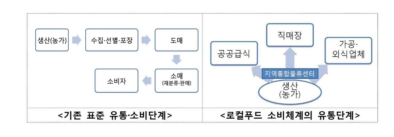 현재 정부 정책은 지역단위 로컬푸드 소비체계의 구축이다. 농가에서 생산된 농산물을 지역통합물류센터에서 수거, 학교(공공급식), 직매장, 기공/외식업체에 공급하는 것을 목표로 한다.