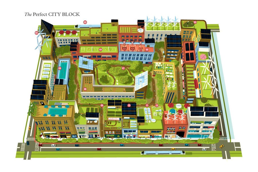 글로벌 라이프스타일 잡지 모노클(Monocle)이 2014년 ‘완벽한 도시 구역(The Perfect City Block)’을 도해한 포스터를 공개했다.