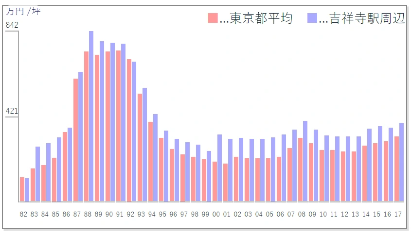 1980년대 이후 도쿄와 기치조지의 공시 지가 추이가 포스트 버블 시대에 부동산 경기 침체를 단적으로 보여준다. 1993년 이후 도쿄와 기치조지의 공시 지가가 급격히 하락해 2016년까지도 회복하지 못했다.