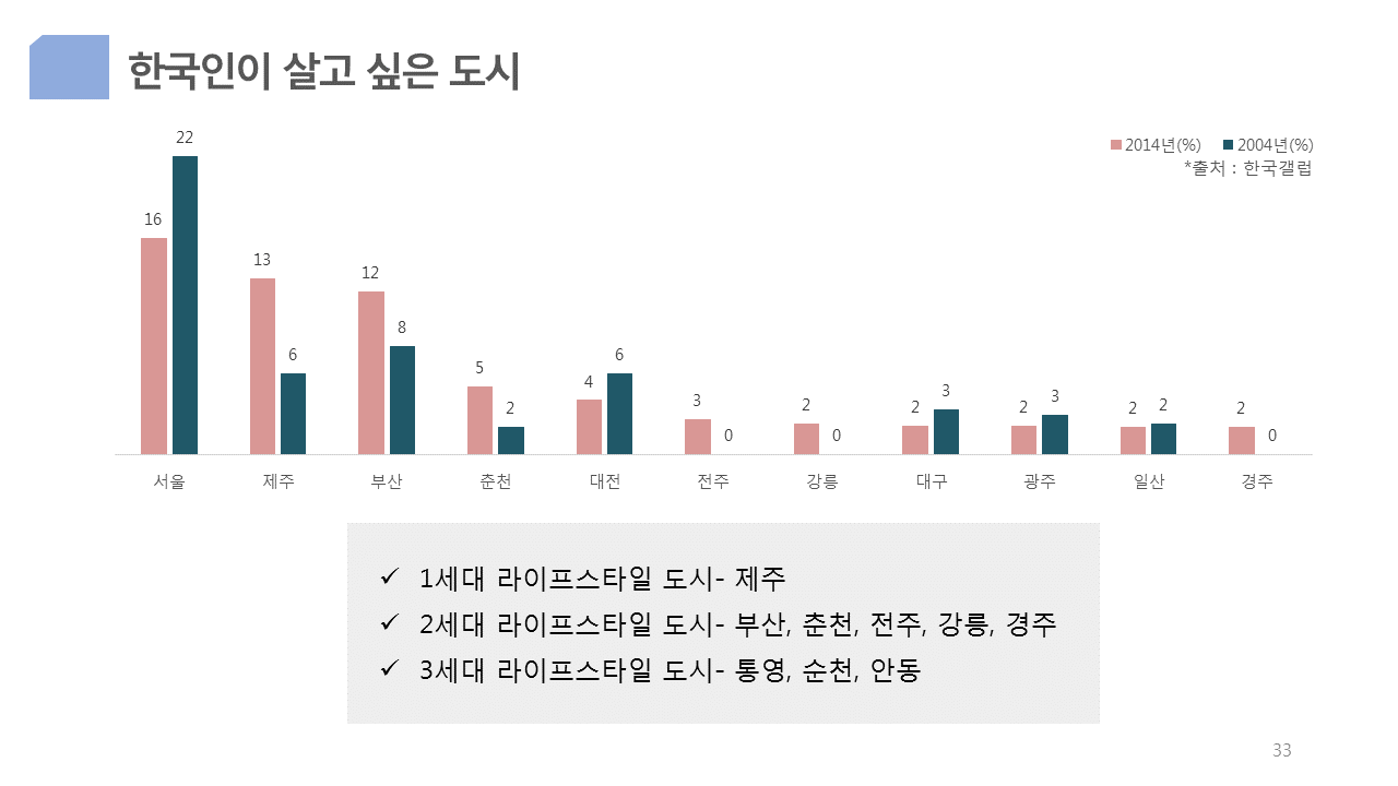 우리나라의 라이프스타일 도시는 어디일까요? 한국에 사람과 돈, 그리고 인재가 모인 기업이 모이는 지역 도시가 있다면 그곳은 제주입니다. 한국이 살고 싶어 하는 도시 자료입니다. 2014년 현재 한국에서 서울 다음으로 인기 좋은 도시가 제주입니다. 2004년에 비해 서울 선호다 떨어진 것도 흥미로운 현상입니다. 탈서울, 귀농귀촌 현상이 보여주듯이 서울 장악력이 많이 약해졌습니다.