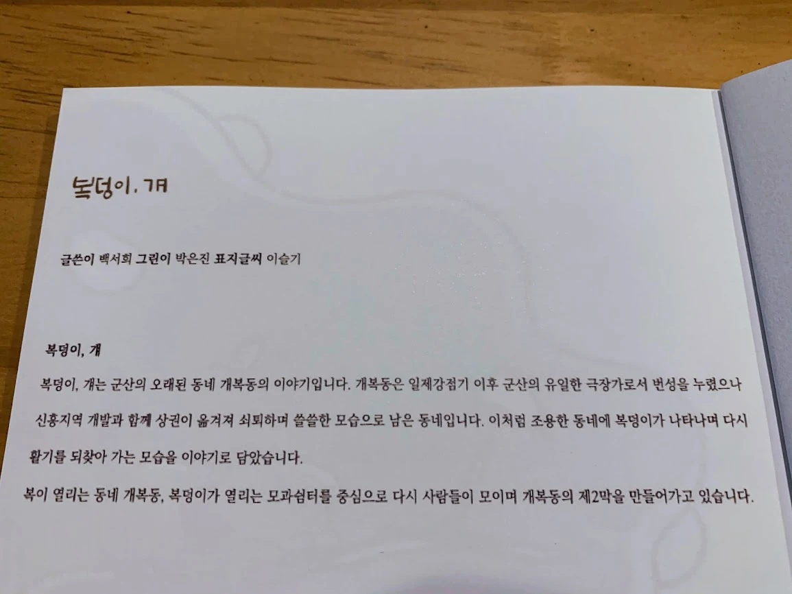 개복동 복덩이, 개 - 복덩이, 개는 군산의 오래된 동네 개복동의 이야기입니다. 개복동은 일제강점기 이후 군산의 유일한 극장가로서 번성을 누렸으나 신흥지역 개발과 함께 상권이 이동해 쓸쓸한 모습으로 남은 동네입니다. 이처럼 조용한 동네에 복덩이가 나타나며 다시 활기를 되찾아 가는 모습을 이야기로 담았습니다. 복이 열리는 동네 개복동, 복덩이가 열리는 모과쉼터를 중심으로 다시 사람들이 모이며 개복동의 제2막을 만들어가고 있습니다. 글쓴이 백서희 그린이 박은진 표지 글씨 이슬기