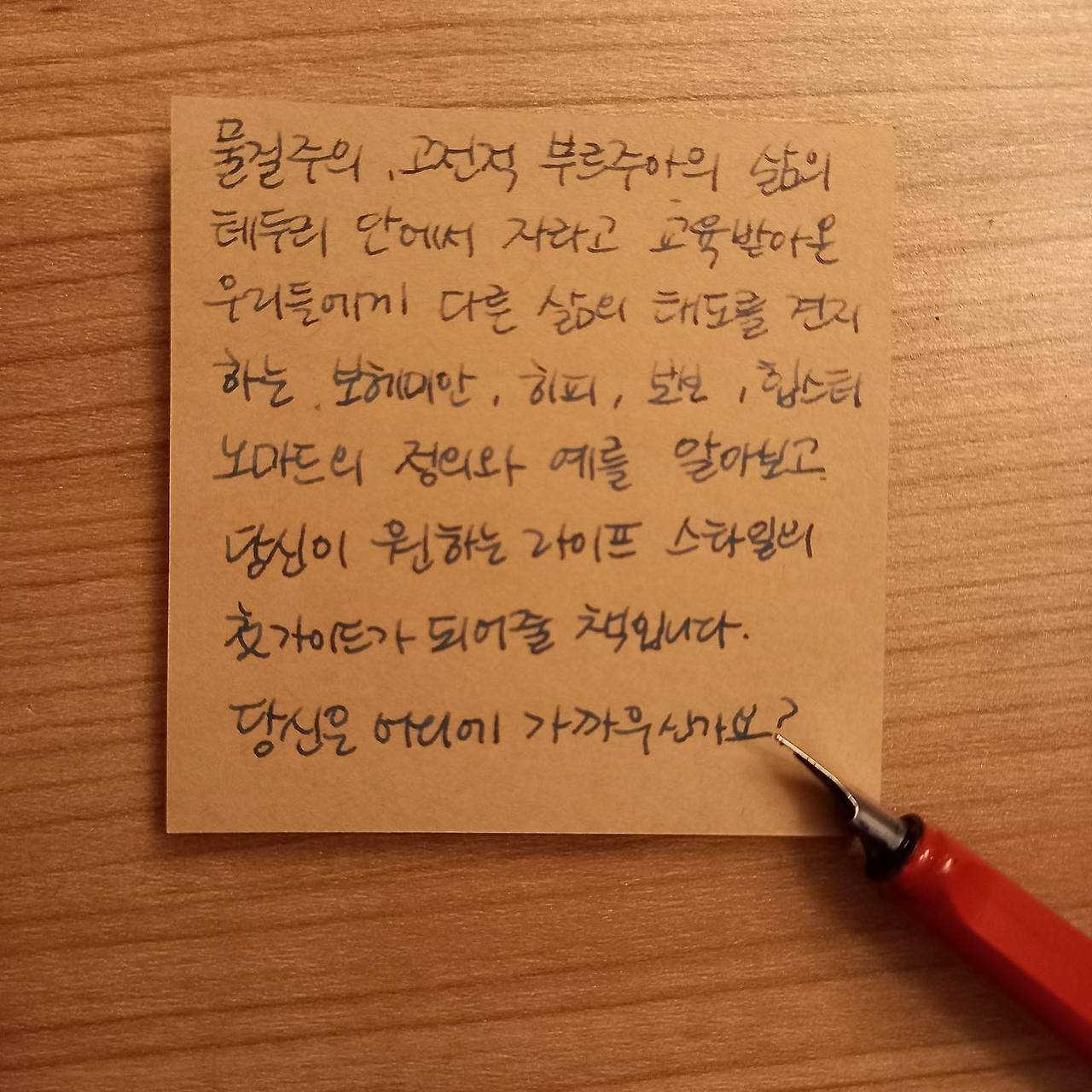 책 소개문 - 책 출판 준비할 때 제목, 부제만큼 소개문 작성에 고민을 많이 합니다. 오늘 인스타에 올라온 소개문입니다. 처음부터 이리 소개했으면 좋았을 것 같다는 생각이 들었습니다. 소개자는 안동 풍천의 작은 마을에서 한옥서점 가일서가를 운영합니다. "물질주의, 고전적 부르주아의 삶의 테두리 안에서 자라고 교육받아온 우리들에게 다른 삶의 태도를 견지하는 보헤미안, 히피, 보보, 힙스터, 노마드의 정의와 예를 알아보고 당신이 원하는 라이프 스타일의 첫 가이드가 되어줄 책입니다. 당신은 어디에 가까우신가요?" #가일서가