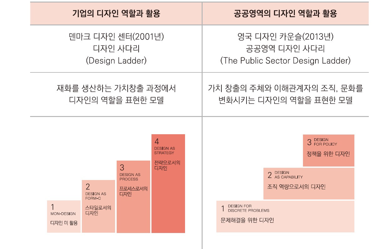 디자인을 이처럼 문제 해결 방법으로 활용하면 기업과 공공기관 의사 결정의 전 과정에 적용될 수 있다. 위의 그림이 보여주듯이 기업은 재화를 생산하는 가치 창출 과정에서 디자인을 스타일링, 프로세스, 전략을 개선하는 방법으로 활용할 수 있다. 공공기관은 디자인 툴을 사용해 가치 창출의 주체와 이해관계자의 조직, 문화를 변화시킬 수 있다.