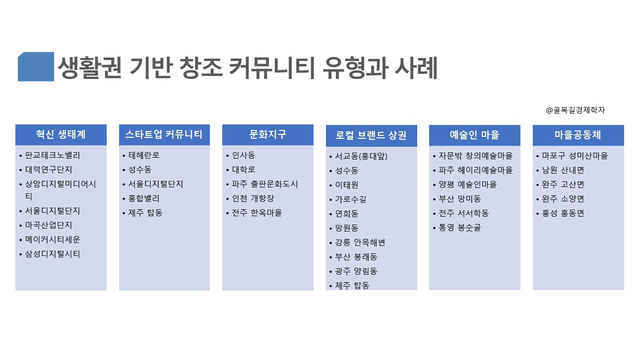 정리하면, 창조 커뮤니티에는 국가 또는 지역 단위의 혁신 생태계, 지역 단위의 스타트업 커뮤니티, 로컬 브랜드 상권, 문화지구(문화특구), 예술인 마을, 마을 공동체 등 총 6개의 유형을 찾을 수 있다. 이중 국가 단위 생태계는 광역경제권, 지역 단위 생태계는 지역생활권, 나머지 4개 생태계는 (적어도 시작 단계에서는) 동네 생활권 중심으로 육성해야 한다. 보다 체계적인 조사가 필요하지만, 각 유형을 대표하는 창조 커뮤니티 사례를 아래 표에 정리했다. 창조 커뮤니티의 지리적 범위를 삶의 질을 확보할 수 있는 생활권으로 설정하고, 동네 생활권을 새로운 창조경제 단위로 제안한다.