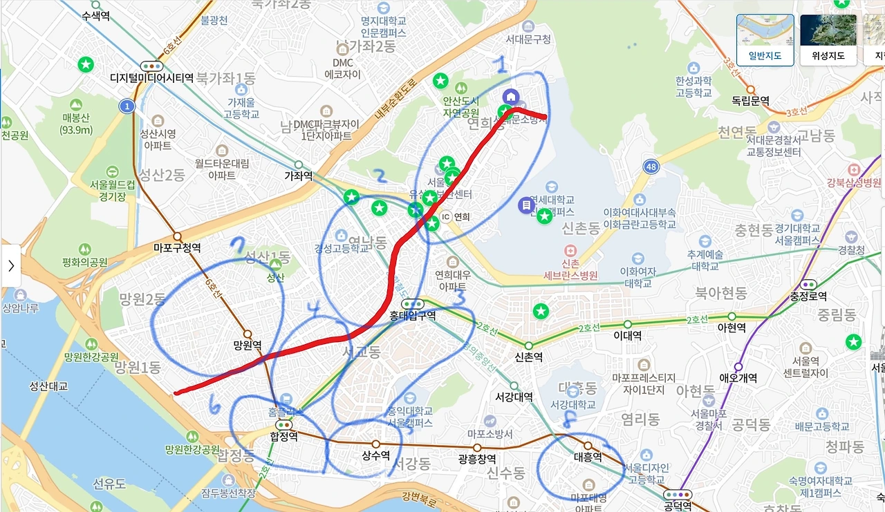 중로와 이면도로의 격자형 구조망이 가장 광범위하게 펼쳐진 지역이 홍대앞이다. 서교동에서 시작된 홍대앞은 격자형 구조망을 통해 연희동(1), 연남동(2), 서교동 동부(3), 서교동 서부(4), 상수동(5), 합정동(6), 망원동(7), 대흥동(8) 등 현재 7개 동, 8개 소권역으로 확장했다.