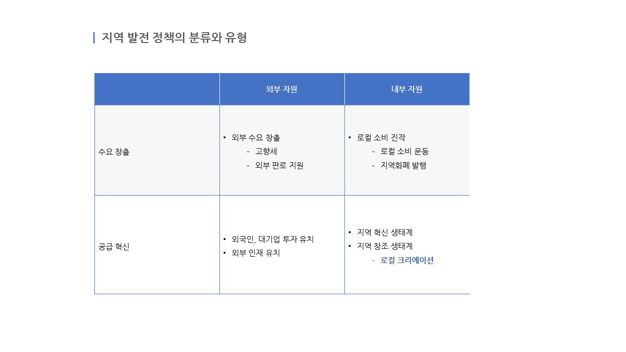 지역발전 정책도 독립적 설루션 도출 능력 강화 중심으로 재편해야 한다. 지역발전 정책은 자원 동원 방법에 따라 외부 자원과 내부 자원, 경쟁력 확보 방법에 따라 수요 창출과 공급 혁신으로 분류할 수 있다.
