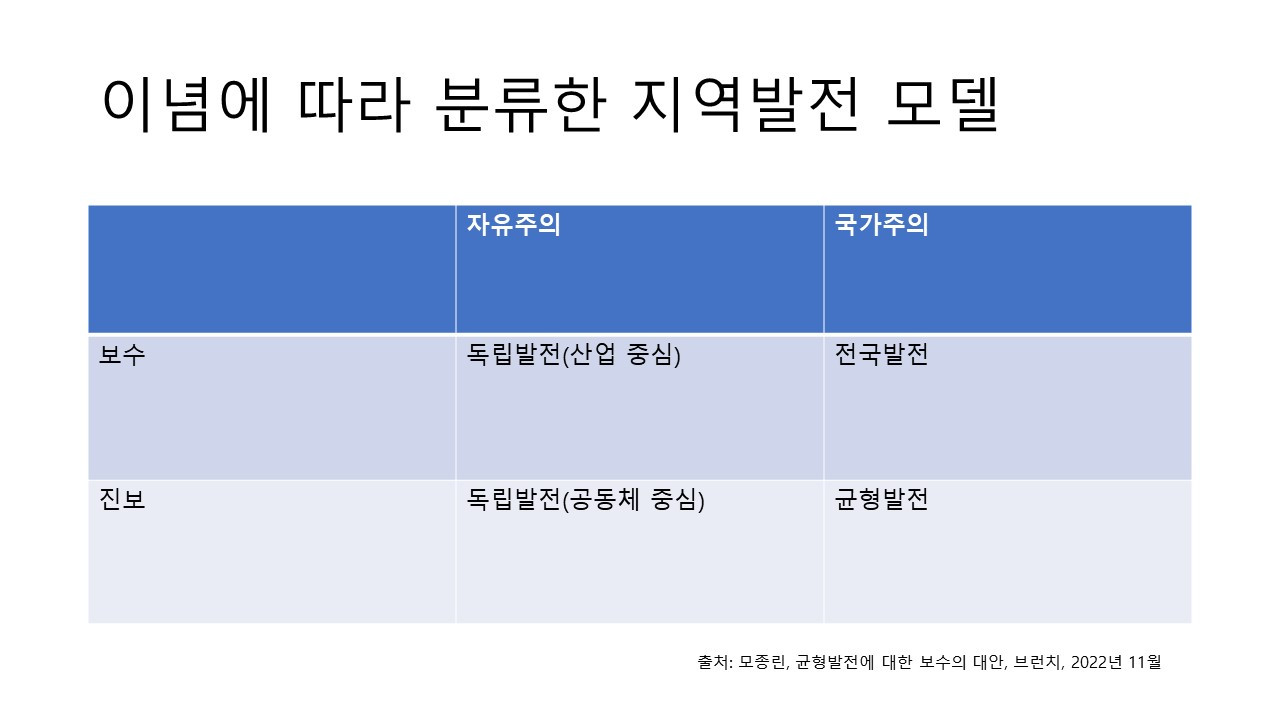 지역발전 모델에 대한 다양한 시각을 정리하는 방법이 대안을 이념으로 정리하는 것이다. 한국에는 국가주의 보수, 자유주의 보수, 국가주의 진보, 자유주의 진보 이렇게 4개의 정파가 경쟁한다는 것이 필자의 주장이다. 국가주의 보수가 선호하는 지역발전 모델은 지역 구분하지 않고 전국 단위 효율성을 추구하는 전국발전이다. 자유주의 보수가 지역의 독립적 산업 생태계에 기반한 지역발전, 즉 독립발전을 선호한다. 균형발전을 지역발전을 국가 구도에서 조정하려는 국가주의 진보의 정책이다. 자유주의 진보는 이와 달리 지역 공동체 중심의 독립발전을 선호한다.