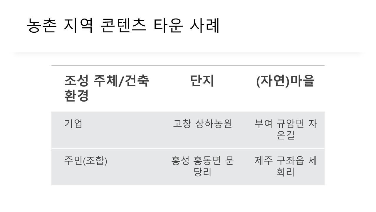 마을 단위에서도 로컬 콘텐츠 성공 사례를 찾을 수 있다. 제주 구좌읍 세화리, 부여 규암면 자온길, 홍성 홍동면 유기농마을, 강릉 초당동 순두부마을, 양양 죽도면 서핑마을, 고창 상하면 상하농원이 대표적인 로컬 콘텐츠 타운이다.