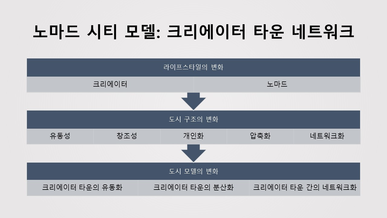 하지만 노마드 라이프스타일의 확산은 유동화, 분산화, 네트워크화를 통해 크리에에터 타운의 구조를 변화시킨다. 크리에이터 타운의 유동화는 이 도시의 공간, 상권, 콘텐츠를 더욱 유동적으로 만든다. 크리에이터 타운의 분산화는 중심부와 교외 구조를 해체하고, 중심부와 교외에 다수의 크리에이터 타운을 형성한다. 분산화가 진행됨에 따라 노마드 시티는 이렇게 분화된 크리에이터 타운들을 연결하는 네트워킹의 도전에 직면한다. 노마드 시티는 크리에이터 타운의 유동화, 분산화, 연결화를 통해 '크리에이터 타운 네트워크'로 진화할 것이다.
