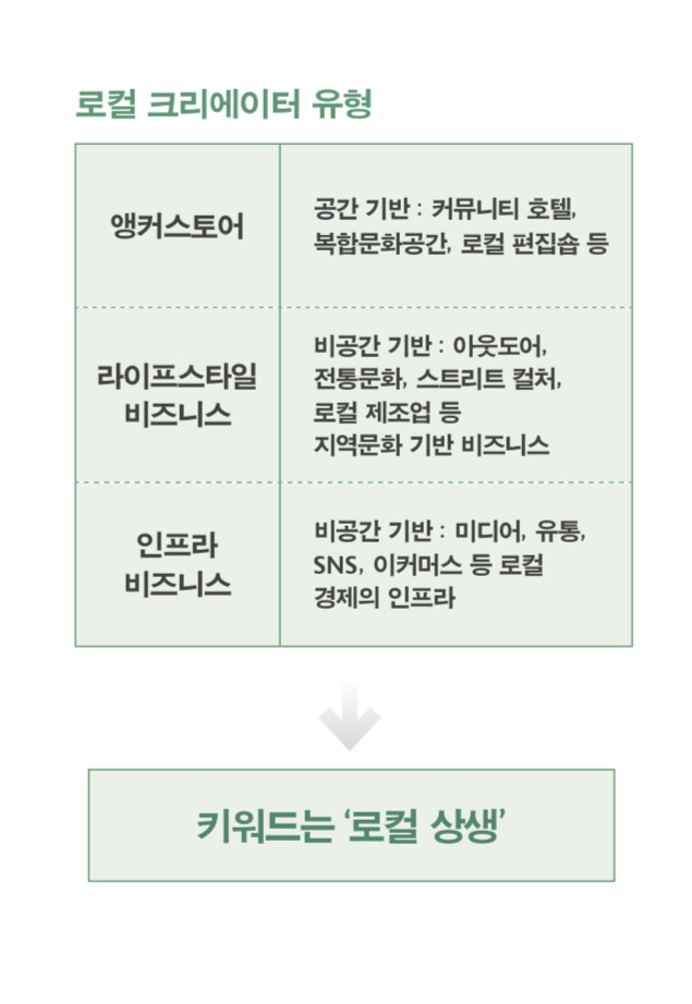 '머물고 싶은 동네가 뜬다'는 이렇게 정의한 로컬 크리에이터를 다시 세 가지 유형으로 세분한다. 공간 기반의 앵커스토어, 공간을 운영하지 않는 라이프스타일 비즈니스, 로컬 크리에이터에게 서비스를 제공하는 인프라 비즈니스이다. 앵커스토어는 업종 수에 따라 단일 업종 앵커스토어와 복수 업종 앵커스토어로 구분될 수 있다. 카페, 베이커리, 슈퍼마켓, 독립서점, 로컬 푸드 등이 앵커스토어에서 흔히 발견할 수 있는 업종이다. 최근 트렌드는 여러 업종을 연결하거나 운영하는 복수 업종 앵커스토어다. 마이크로 타운, 복합문화공간, 커뮤니티 호텔, 로컬 편집숍 등이 대표적인 복수 업종 앵커스토어 모델이다. 라이프스타일 비즈니스는 아웃도어, 전통문화, 스트리트 컬처, 로컬 기술, 로컬 제조업 등 지역문화와 자원을 활용해 다양한 라이프스타일 상품과 서비스를 생산하는 기업이다.