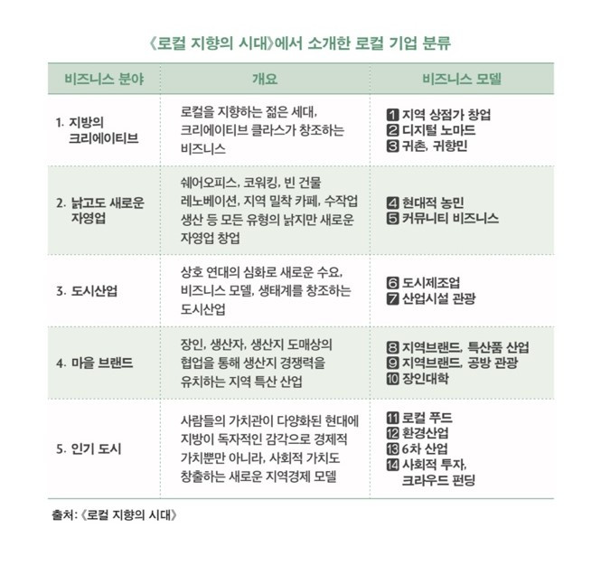 '로컬 지향의 시대'는 로컬 비즈니스를 5개 분야, 14개 비즈니스 모델로 분류한다. 지역자원을 창의적으로 사업화하는 크리에이티브 비즈니스, 낡고 오래된 지역자원을 재생하는 재생 비즈니스, 지역산업 생태계에 오래 축적된 신뢰 자본을 바탕으로 생성된 도시제조업, 생산지 경쟁력을 바탕으로 한 마을 브랜드, 지방 고유의 문화로 새로운 사회적 가치를 창출하는 사회적 기업 등이다.