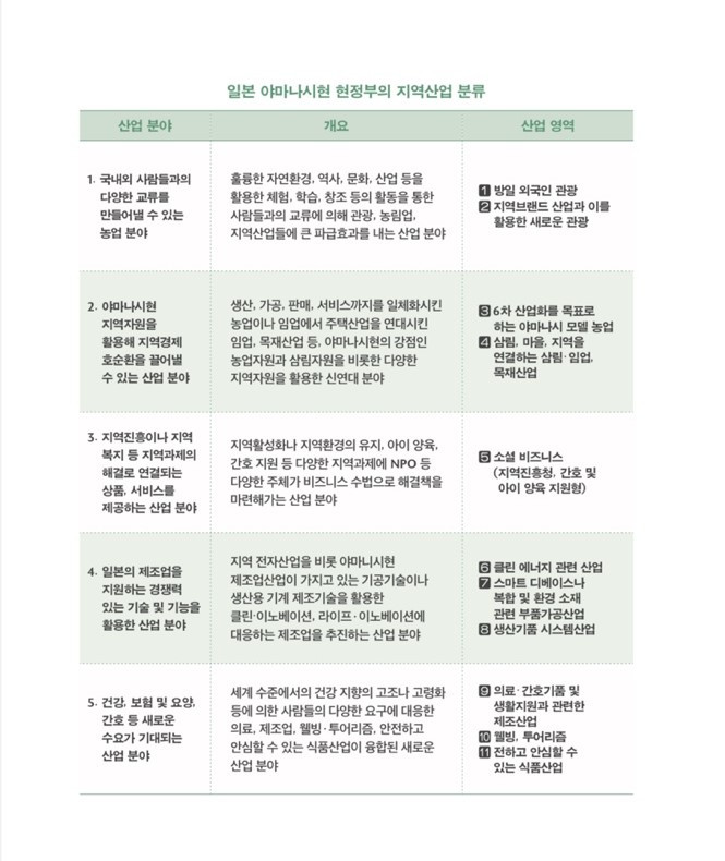 일본 야마나시현은 지역에서 성장을 기대할 수 있는 분야를 5개 분야, 11개 영역으로 정의한다. 5대 분야는 ① 관광산업, 지역브랜드 산업 등 국내외 사람들과의 다양한 교류를 만들어 낼 수 있는 농업분야, ② 6차 산업화 농업, 산림·마을·지역을 연결하는 산림·임업·목재산업 등 야마나시현의 지역자원을 활용하여 지역경제의 선순환을 이끌어 낼 수 있는 산업 분야, ③ 소셜 비즈니스·벤처 등 지역진흥이나 지역복지 등 지역과제의 해 결로 연결되는 상품·서비스를 제공하는 산업 분야, ④ 클린에너지, 부품과 생산 시스템 산업 등 일본의 제조업을 지원하는 경쟁력 있는 기술 및 기능을 활용한 산업 분야, ⑤ 의료기기, 생활산업, 웰빙, 식품산업 등 건강, 보험·요양, 간호 등 새로운 수요가 기대되는 산업 분야이다.