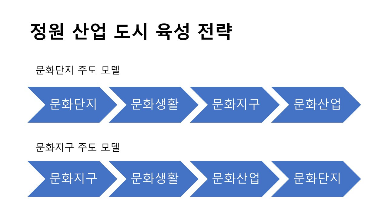 문화지구 주도 성장 모델은 문화지구를 우선적으로 추진하는 전략이다. 문화지구 내에서 정원 산업 생태계를 구축하고 이를 문화생활, 문화산업, 문화단지로 확장하는 전략이다. 위에서 제안된 정원 콘텐츠 메이커 스페이스를 문화지구에 통합하면 문화지구의 파급효과를 크게 확대할 수 있다.