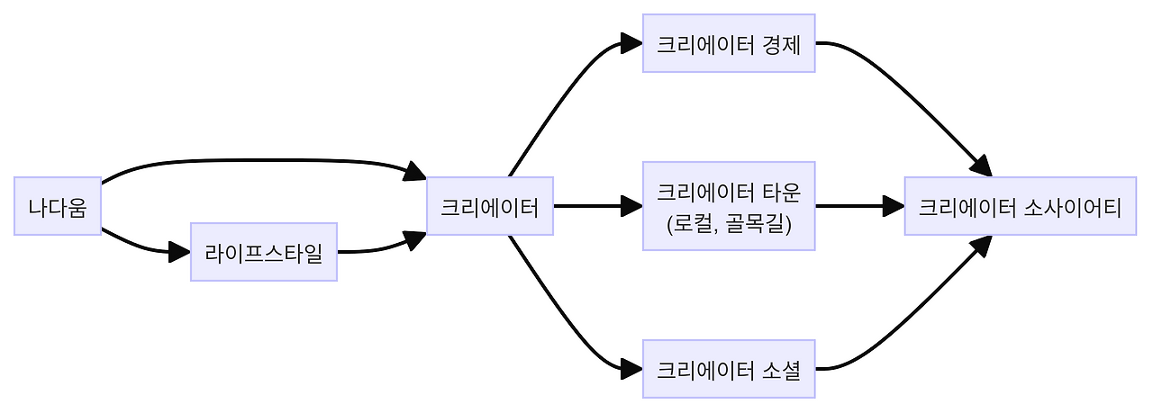 이 플로우 차트는 라이프스타일, 로컬, 골목길 등 그동안 내가 작업해 온 키워드가 크리에이터 구도에서 어떤 역할을 하는지 보여준다. 라이프스타일은 나다움과 크리에이터의 중간 단계, 로컬과 골목길은 크리에이터 타운의 구성 요소다.