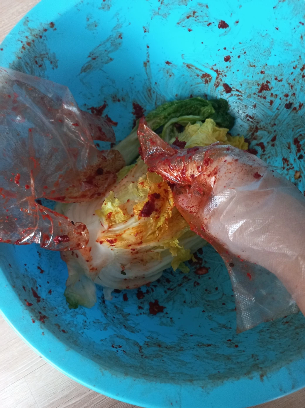 나를 포함해서 두 분 다 장갑을 끼고 있었고 이번에는 나도 양념을 바르고 배추를 칼로 흠집내서 두 동강 낸다고 잔심부름을 하지 못했는데 아빠가 힘쓰는 일이나 갖다 주시는 일과 바로바로 설거지도 해주시고 바닥에 양념장이 튀면 바로 닦아주셔서 편했다. 굿 어시스턴트! 아빠는 그때그때 적재적소에 맞춰서 딱 딱 해주시는 걸 잘하신다고 평소에도 생각했지만 이번에도 정말 잘 챙겨주셨다. 양념장은 바닥에 흘린 걸 바로 닦지 않으면 장판에 물이 들 수 있어서 닦아줘야 했는데 바로 닦아주시니 장갑을 안 빼도 하던 일에 집중해도 돼서 좋았다.