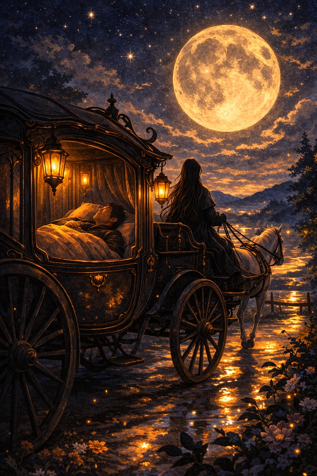 마차는 별빛이 흐르는 밤길을 천천히 달립니다.