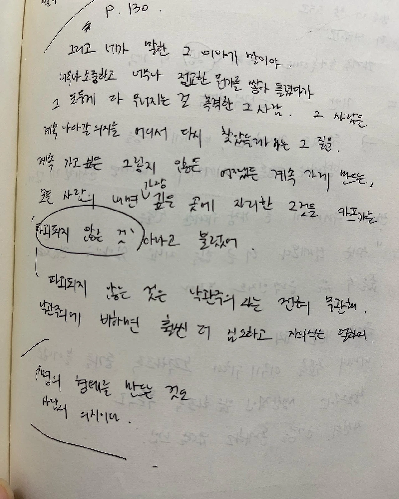 그렇지만 내가 이 책을 교환식에 가져온 이유는 단 하나였다. 작년의 기억을 흘려보내겠다는 다짐. 그것뿐이었다. 이제 나는 더 이상 같은 문제로 괴로워하지 않겠다는 나만의 약속이다. 나는 이제 더 이상 한지를 떠올리며 아파하지 않을 것이다.