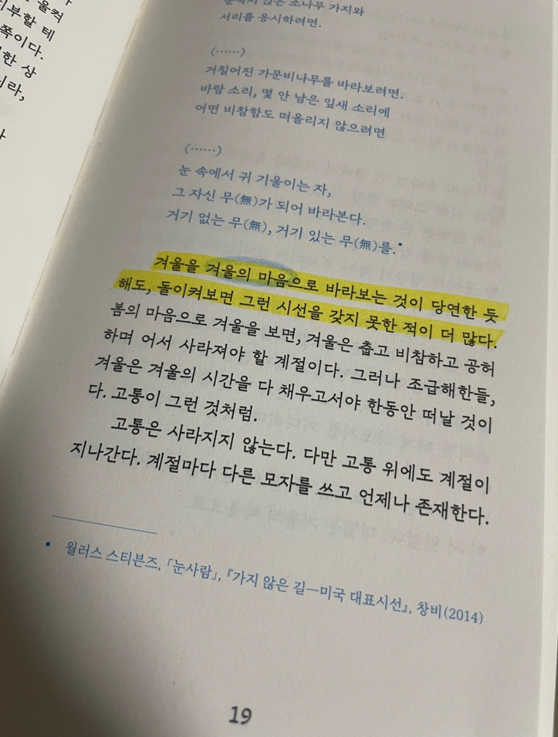 마음속에 오래도록 지키고 싶은 문장을 한 가지씩 준비해 놓고 끝까지 버팁시다. 넌덜머리가 나고 억울해서 다 집어치우고 싶을 때마다 그 문장을 소리 내어 입 밖으로 발음해 보며 끝까지 버팁시다. 저는 끝까지 버티며 계속해서 지겹도록 쓰겠습니다. 여러분의 화두는 무엇입니까.