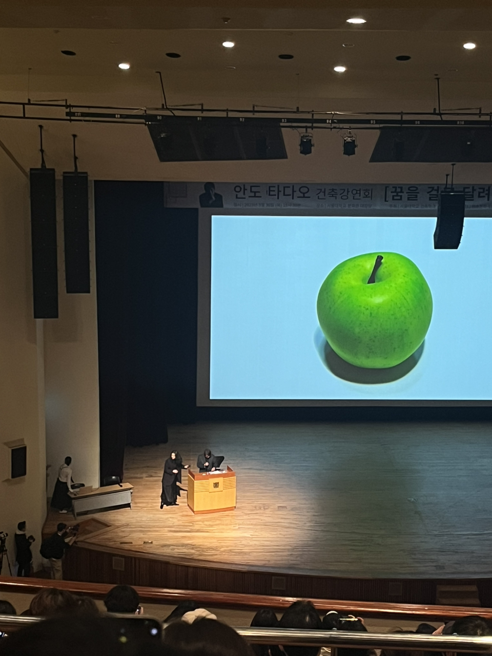 지난 3월 30일, 서울대에서 하는 안도 다다오 선생님의 <꿈을 걸고 달려라>에 다녀왔다. 안도 다다오가 설명하는 자신의 건축물들이 어떤 식으로 설계를 했는지 비전공자인 나는 정확하게 모든 걸 이해할 수는 없고, 그분의 감히 삶을 이루어 짐작할 수는 없다. 안도는 올 해로 82세이며, 현재 담낭, 담관, 십이지장, 췌장, 비장을 적출한 상태라고 하셨다.