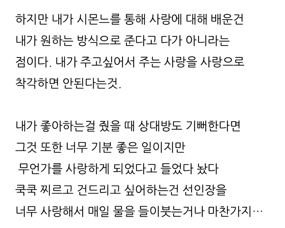 그렇게 본 대상에는 내가 그렇게 미워할 이유가 없을 만큼 대상에게도 존재의 이유가 있었고, 나와 같이 대상에게도 그 만의 세계가 있었으며, 그의 곁을 지켜주고 사랑해 주는 사람들이 있었다. 이 부끄러웠던 감정을 마주하고 있는 그대로 받아들이기까지의 시간은 꽤나 오래 걸렸다.
