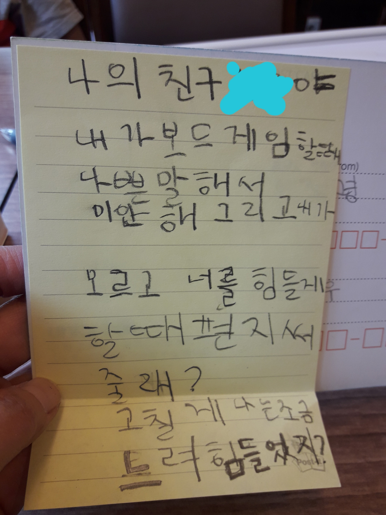나의 친구 동이야 내가 보드게임할 때 나쁜 말 해서 미안해. 그리고 내가 모르고 힘들게 할 때 편지 써줄래? 고칠게. 나는 조금 느려. 힘들었지? (동이는 가명입니다)