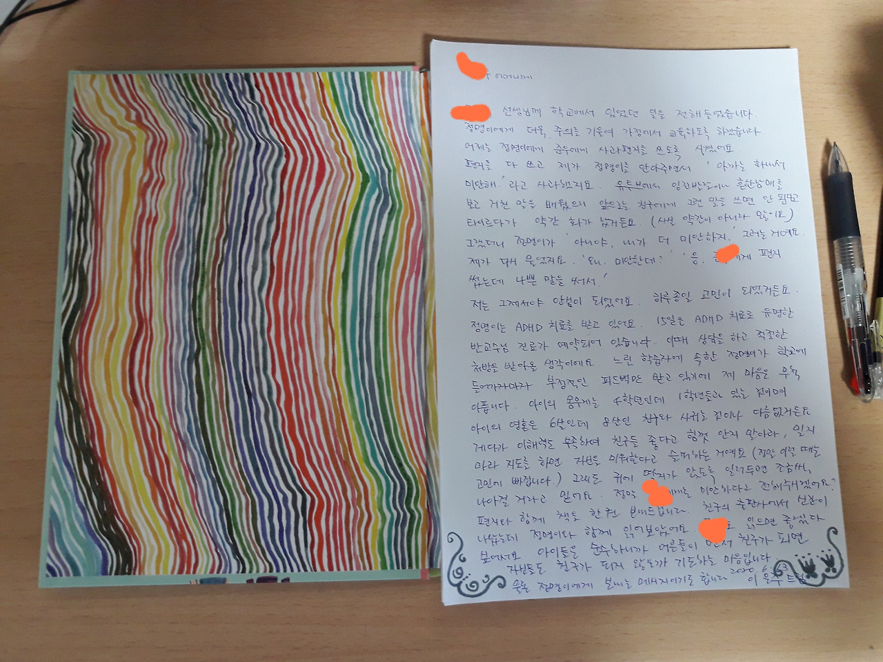 선생님께 학교에서 있었던 일을 전해들었습니다. 정명이에게 더욱 주의를 기울여 가정에서 교육하도록 하겠습니다. 어제는 정명이에게 동이에게 사과편지를 쓰도록 시켰어요. 편지를 다 쓰고 제가 정명이를 안아주면서 ‘아까는 화내서 미안해.’라고 사과했지요. 유투브에서 잉꼬발랄이나 흔한남매를 보고 거친 말을 배웠으니 앞으로는 친구에게 그런 말을 쓰면 안 된다고 타이르다가 약간 화가 났거든요(사실 약간이 아니라 많이요). 그랬더니 정명이가 ‘아니야, 내가 더 미안하지.’ 그러는 거예요. 제가 다시 물었지요. ‘왜, 미안한데?’ ‘응, 동이에게 나쁜 말을 써서.’ 저는 그제서야 안심이 되었어요. 하루종일 고민이 되었거든요. 정명이는 adhd치료를 받고 있어요. 15일은 adhd 진료가 예약되어 있습니다. 이때 상담을 하고 적절한 처방을 받아 올 생각이에요. 느린 학습자에 속한 정명이가 학교에 들어가자마자 부정적인 피드백만 받고 있기에 제 마음은 무척 아픕니다. 아이의 몸무게는 4학년인데 1학년들과 있는 것이며, 아이의 영혼은 6살인데 8살인 친구와 사귀는 것이나 다름없거든요. 게다가 이해력도 부족하여 친구들 좋다고 힘껏 안지 말아라, 밀지마라 지도를 하면 자신을 미워한다고 슬퍼하는 거예요(정말 이럴 때는 고민에 빠집니다). 그래도 귀에 딱지가 앉도록 일러두면 조금씩 나아질 거라고 믿어요. 정말 동이에게는 미안하다고 전해주시겠어요? 편지와 함께 책을 한 권 보내드립니다. 친구의 출판사에서 신간이 나왔는데 정명이와 함께 읽어보았어요. 동이도 읽으면 좋겠다 싶어서요. 아이들은 순수하니까 어른들이 먼저 친구가 되면 자신들도 친구가 되지 않을까 기도하는 마음입니다. 물론 정명이에게 보내는 메시지이기도 합니다. 2020. 6.13 이은주 드림
