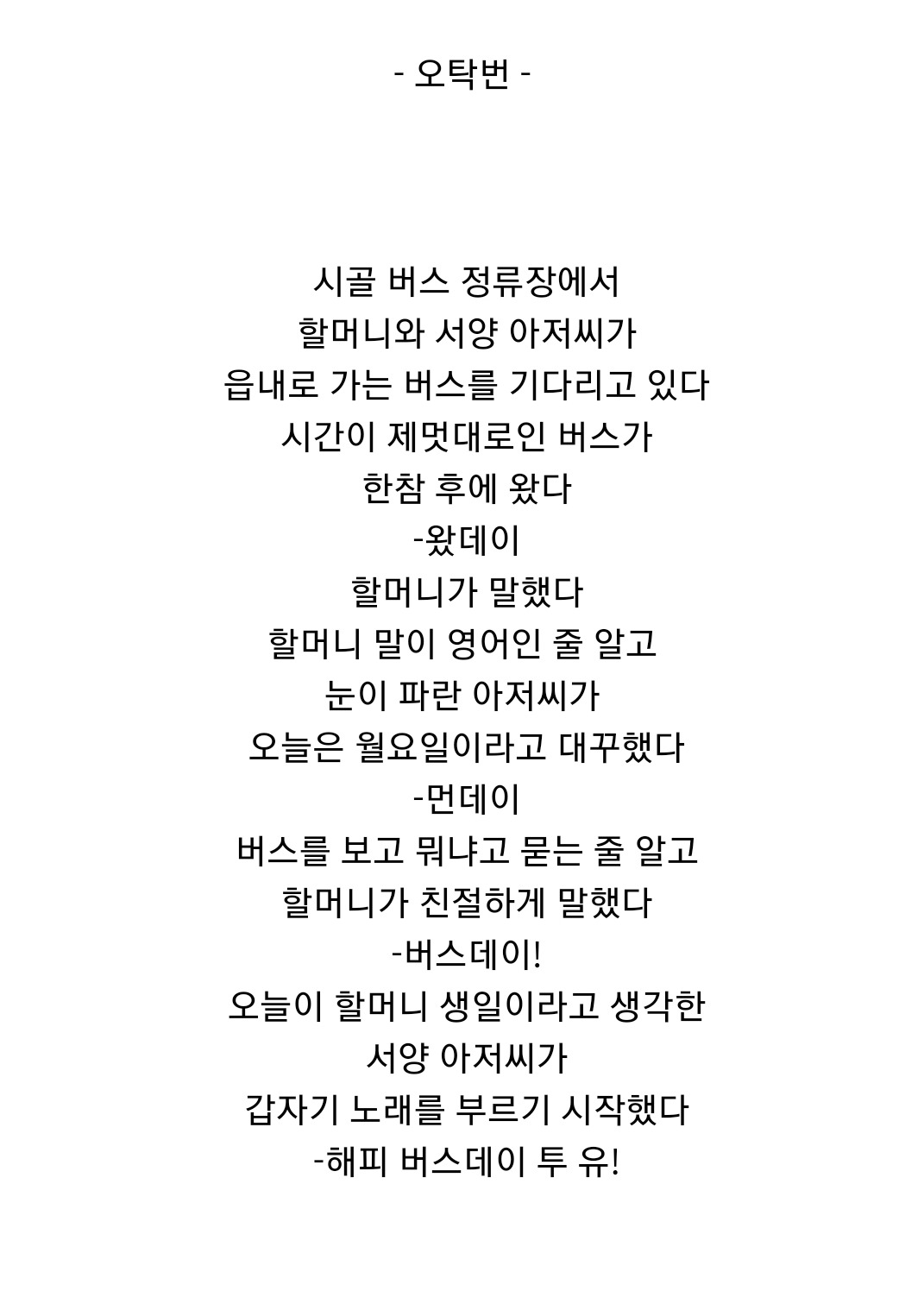 시골 버스 정류장에서 할머니와 서양 아저씨가 읍내로 가는 버스를 기다리고 있다 시간이 제멋대로인 버스가 한참 후에 왔다 -왔데이 할머니가 말했다 할머니 말이 영어인 줄 알고 눈이 파란 아저씨가 오늘은 월요일이라고 대꾸 했다 ---- -먼데이 버스를 보고 뭐냐고 묻는 줄 알고 할머니가 친절하게 말했다 -버스데이 오늘이 할머니 생일이라고 생각한 서양 아저씨가 갑자기 노래를 부르기 시작했다 해피 버스데이 투 유!