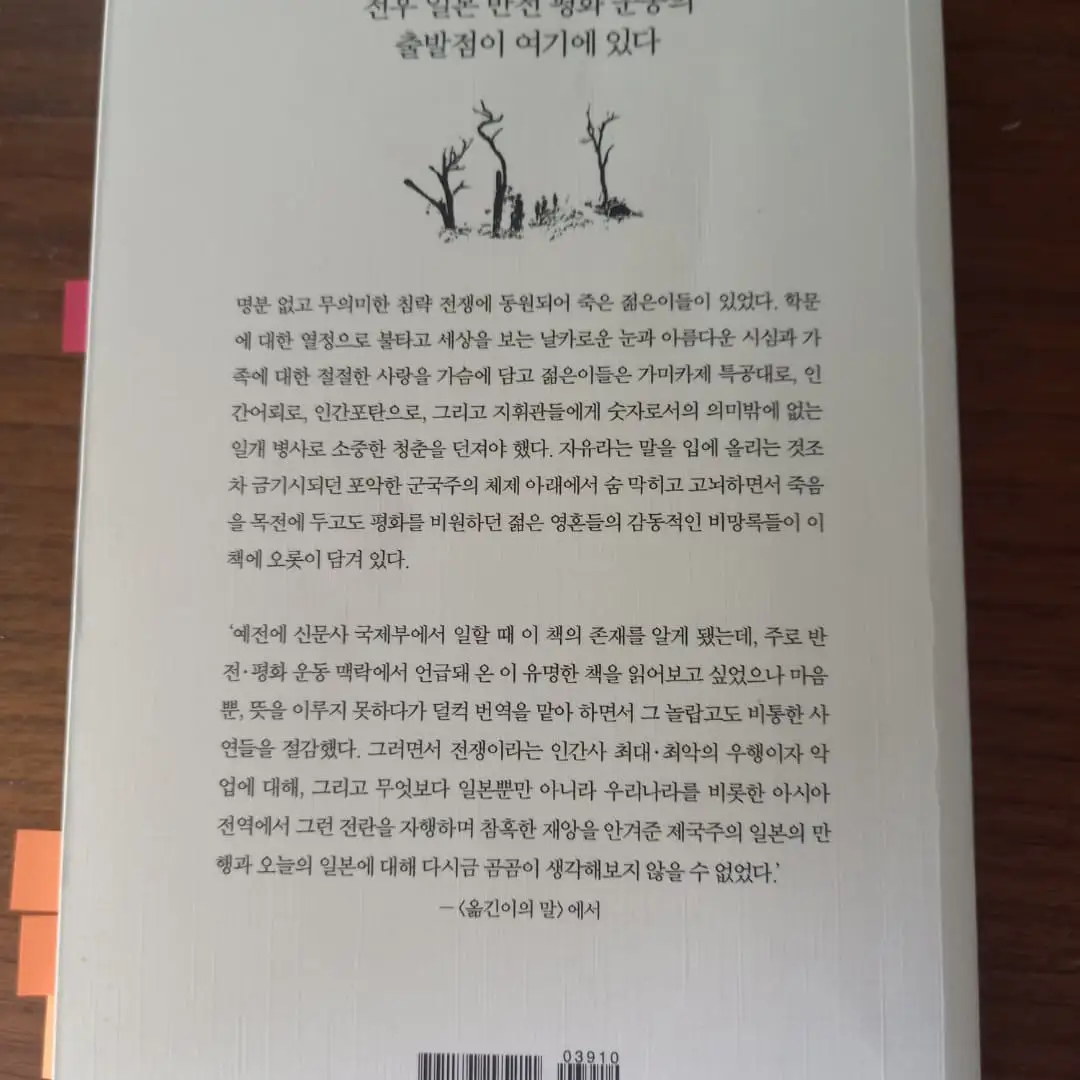 나는 왜 이 사전 번역을 맡았을까? 중일 전쟁, 아시아태평양 전쟁에 동원되어 죽은 일본의 젊은이들을 기록하는 작업은 무슨 의미를 가질까. 이런 질문을 정리하는데 도움을 준 것은 <들어라 와다쓰미의 소리를>이라는 책과 전몰화가 작품이 전시되어 있는 미술관 이름이 무언관인데 <無言館>의 뜻이 보는 사람에 따라 다르게 불리워질 거라는 의미를 가졌다는 것이다. 전자의 책은 이렇게 말한다. 일본 반전 평화 운동의 출발점이 여기에 있다고. 오늘 내가 하는 번역은 미술관의 이름처럼 보는 사람에 따라 다르게 불리워질 것이다. 그러므로 왜 번역하는지에 답하기 보다 어떤 의미를 담아야 할지를 고민하고 싶다.