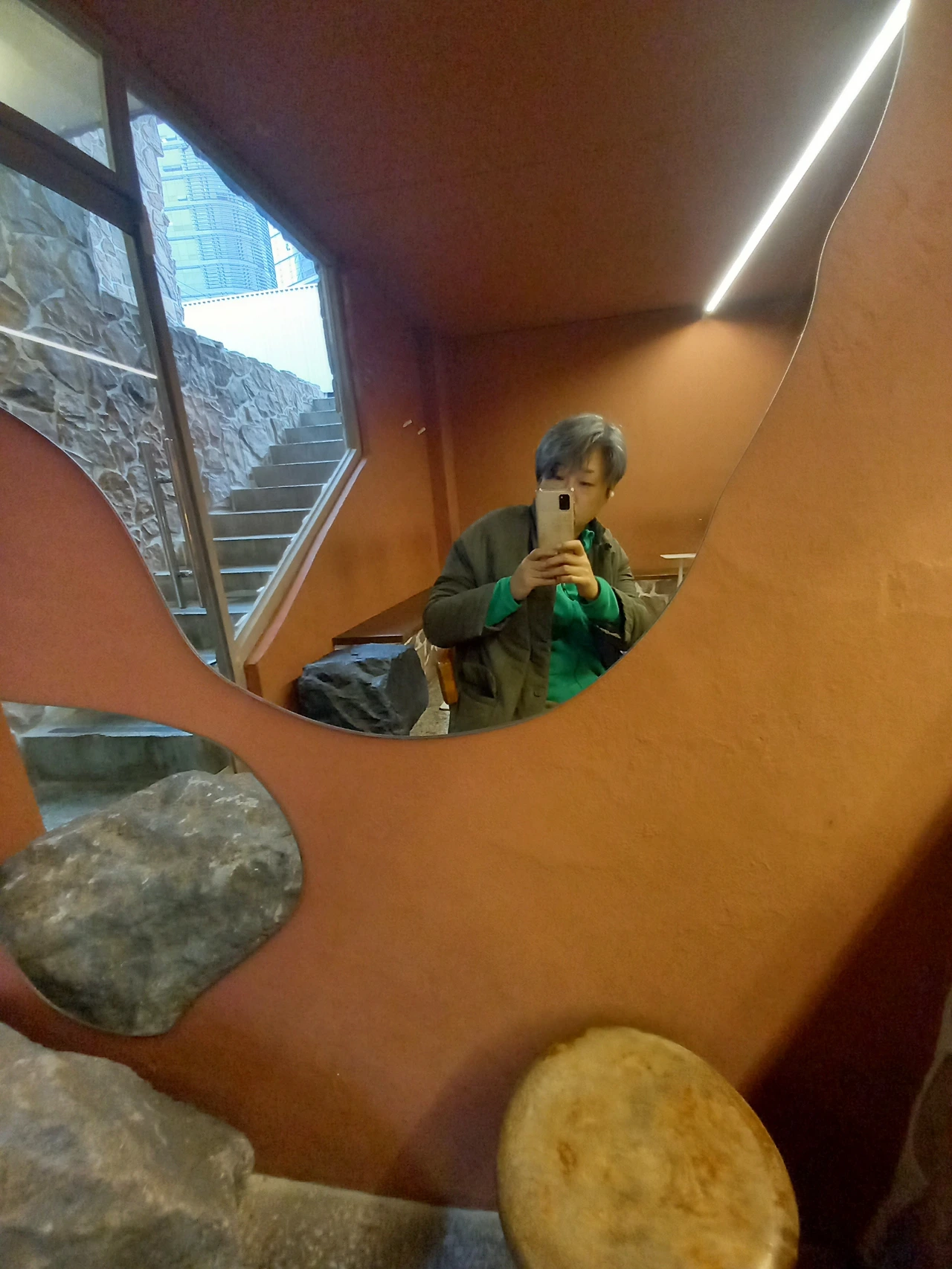 그로토의 지하계단을 내려가면 거울이 있고 그 거울 속 계단으로 더 내려가면 완전 다른 세상이 펼쳐지지요. 마치 옷장 속에 숨으면 다른 세계로 이동하는 것처럼 카페 그로토에서는 잠시 현실을 잊어요. 달구지를 얻어타고 신작로를 달리면 멀리 푸른 보리밭도 나오고 조금 더 달리면 달구지가 트럭으로 변해있지요. 그로토에서 나는 경비행기를 조종하는 비행사도 될 수 있어요. 하늘 위에서는 바다도 내려다 보이고 언덕에는 포도밭이 끝었이 펼쳐져 있는 이곳을 나는 카페 그로토라 부릅니다.