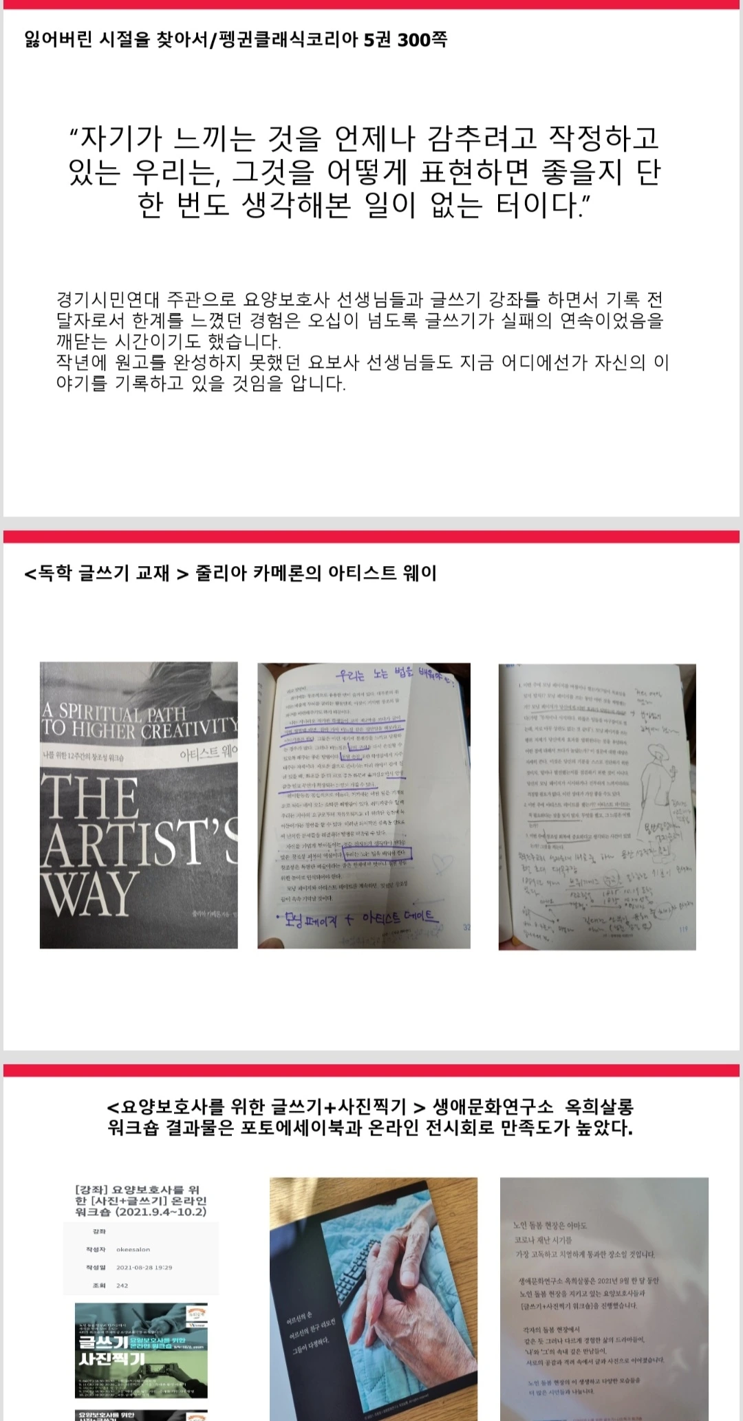 작년에 생애문화연구소 <옥희살롱>에서는 요양보호사를 위한 글쓰기 워크숍이 진행되었습니다. 올해는 보호자를 위한 글쓰기 워크숍을 진행하고 있습니다. 온라인 전시와 포토에세이북을 만든 요양보호사 선생님들의 만족도를 피부로 느낄 수 있었습니다.