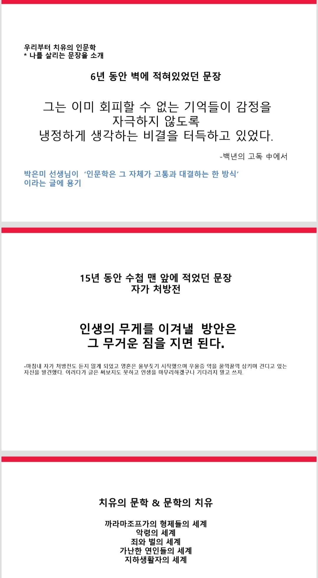 <우리부터 치유의 인문학>에 대해 이야기하라는 제안을 받았을 때 부끄러웠지만 용기를 낼 수 있었던 건 박은미 선생님이 ‘인문학은 그 자체가 고통과 대결하는 한 방식’이라고 한 글에서 용기를 낼 수 있었습니다.