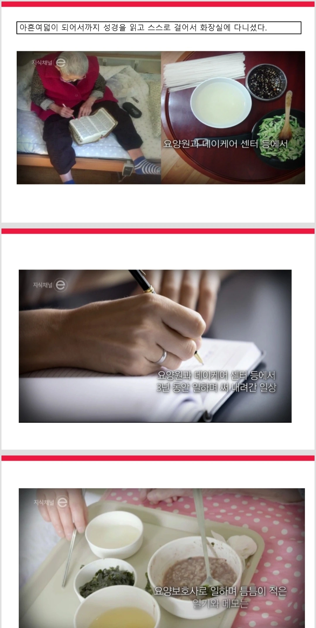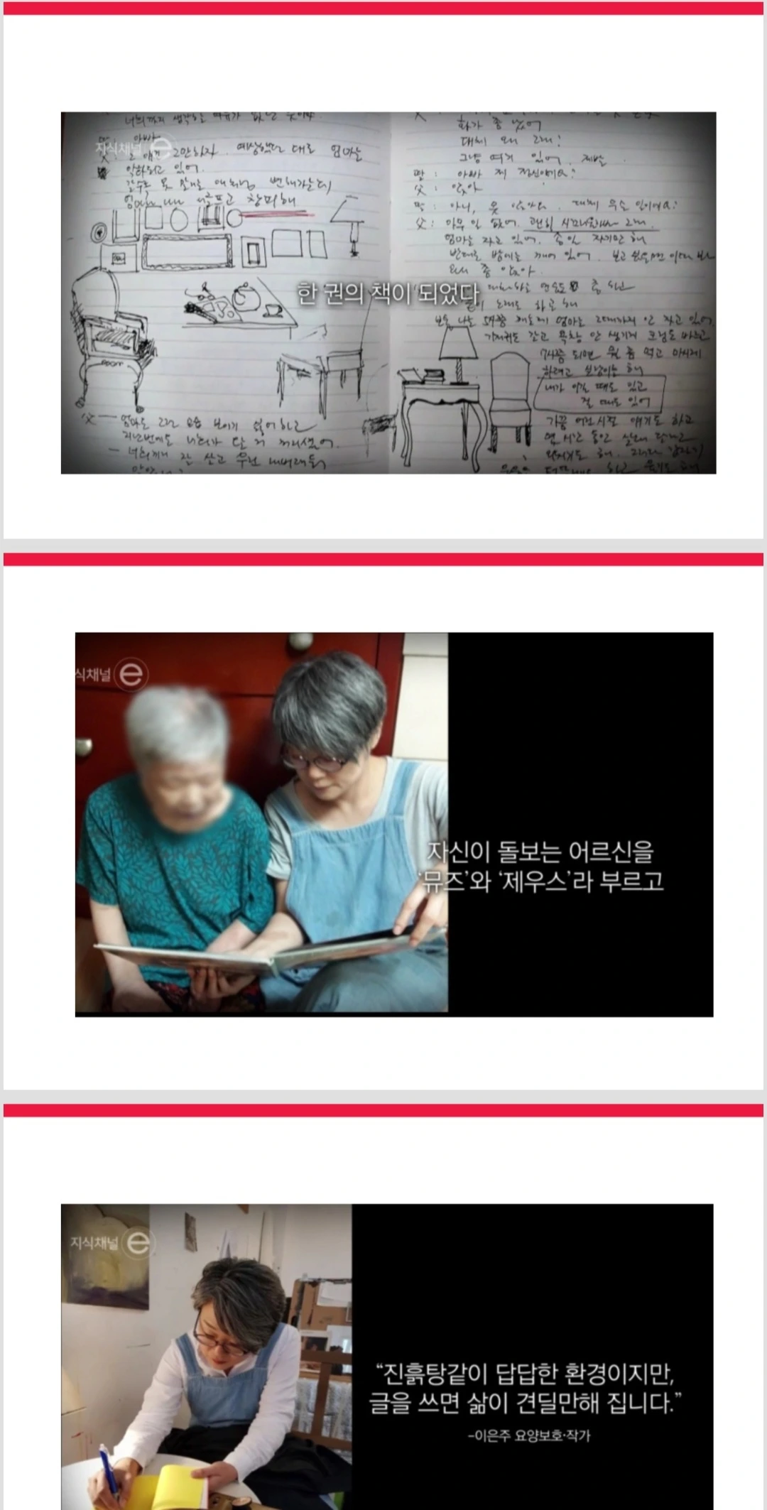 이제 우리는 돌봄을 이야기할 때 돌보는 능력은 물론 돌봄을 받는 능력을 이야기하지 않으면 안 됩니다. 배려가 몸에 붙은 뮤즈와 제우스. 요양원에 부모님을 부탁한 자식들의 요양원 방문 매뉴얼, 돌봄 노동자의 근골격계질환으로부터 보호할 수 있는 노동환경 개선, 노인에 대한 사회적 인식 개선 등을 이야기하고 싶어서 이 자리에 나왔는지도 모릅니다. 물론 돌봄 종사자의 전문직으로서 요구되는 돌봄 지침도 끝없이 수정되어야겠지요. 그렇다면 이런 글을 누가 써서 알려야 할까요? 바로 돌봄 당사자입니다.