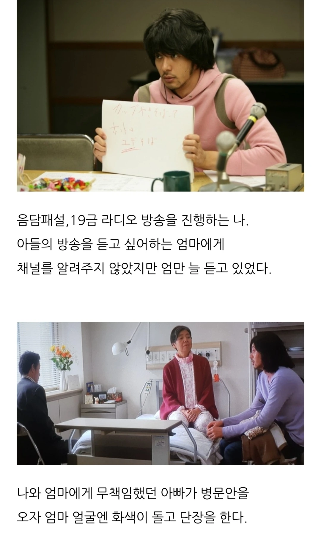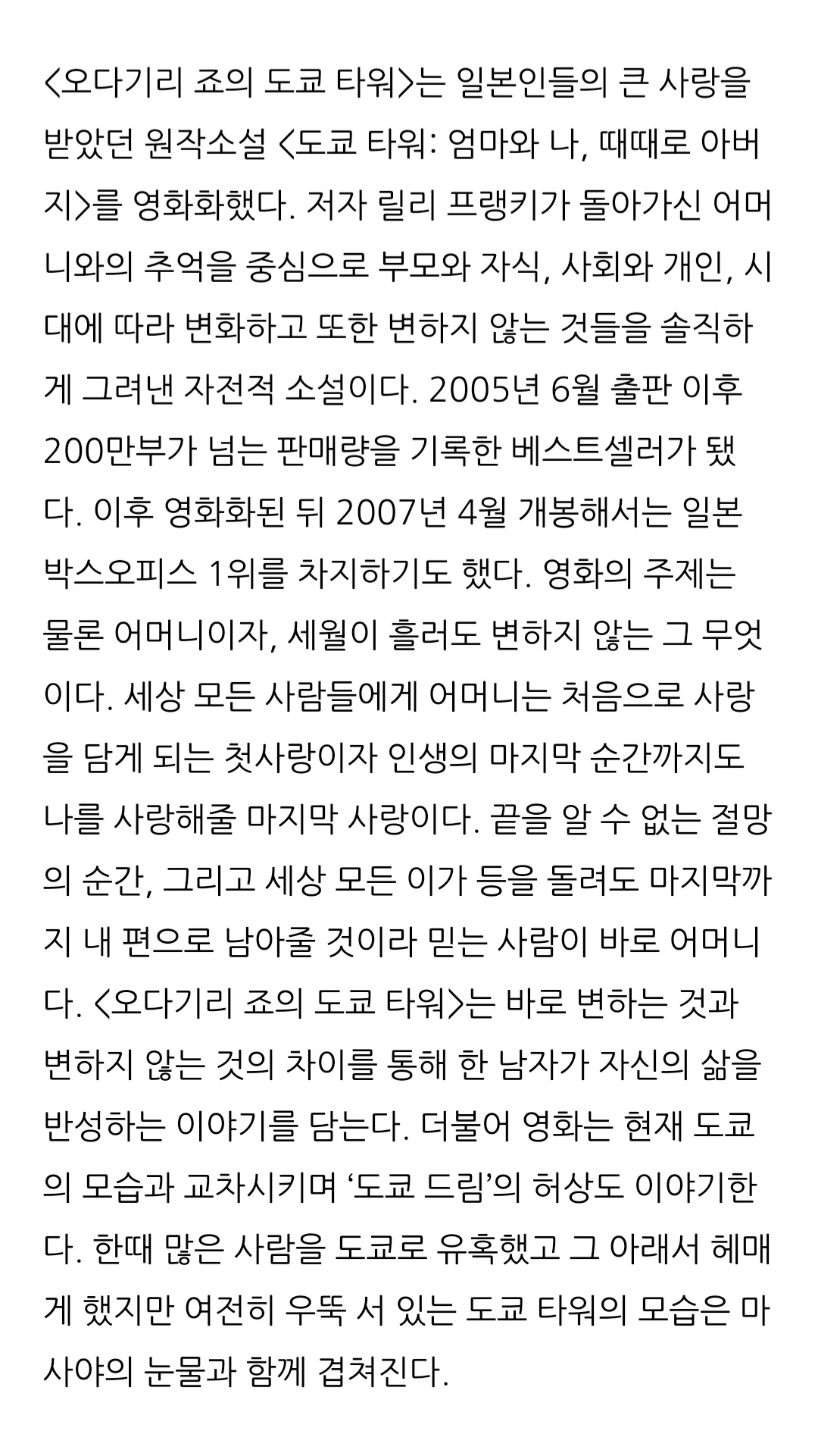 오다기리 죠와 키키 키린 주연의 <도쿄 타워>다. 그 영화에서 아들은 엄마의 장례식 때 원고 독촉(정확히는 확인해봐야겠지만)을 받자 화를 내면서도 약속한 일을 끝낸다. 말 그대로 펑펑 울었다.