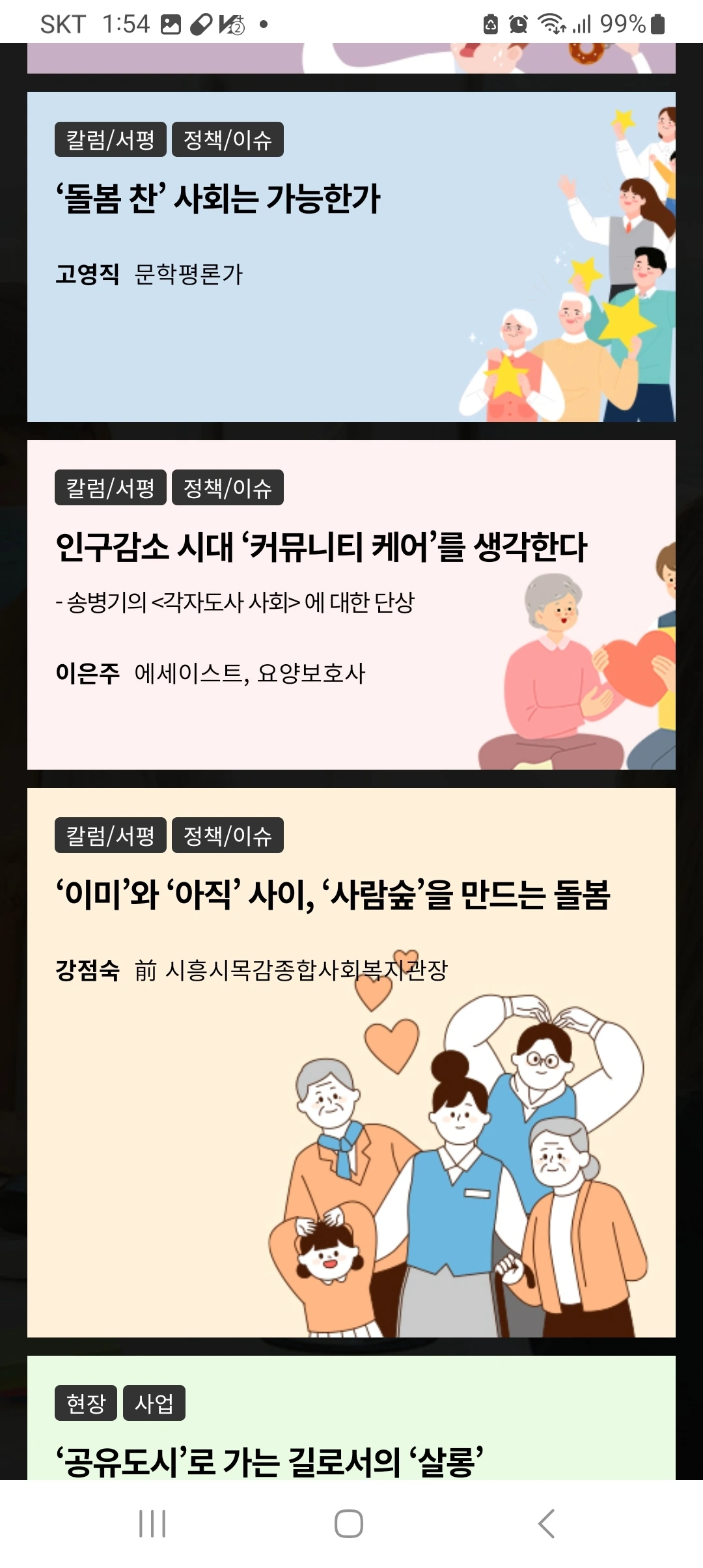 그러면서도 지칠 때면 내가 운영하는 ‘친구가 모두 나보다 잘나 보이는 날엔’ 밴드에 글을 올렸다. 그 커뮤니티는 『나는 신들의 요양보호사입니다』(헤르츠나인 2019)를 출간했을 무렵 만든 것인데 요양원에서 근무하는 요양보호사 선생님들과 재가방문 선생님, 부모돌봄하는 선생님이 답글을 달아준다. 이런 글도 올라온다. 「오늘 남편이 파킨슨 판정을 받았어요」라는 글이 올라오면 ‘나는 십년 동안 파킨슨인 엄마를 돌봤어요. 우리 함께 힘내요.’ 그리고 ‘파킨슨에는 어느 병원, 어느 선생님이 잘 보세요’라는 정보도 올라온다. 고영직의 『삶의 시간을 잇는 문화예술교육』(살림터 2020)에서처럼 ‘행정이 주도하는 방식보다는 공동체의 필요에 의해 자발적으로 움직’이려는 마음의 발로라고 할 수 있겠다. 우리의 커뮤니티 케어는 어디까지가 가능하고,어디까지가 불가능할까. 갇힌 돌봄에서 소통하는 돌봄, 건강한 돌봄을 하기 위해서는 누군가의 도움을 받아야 한다. 누구의 손을 잡을 것인가. 누구에게 부탁을 할 것인가