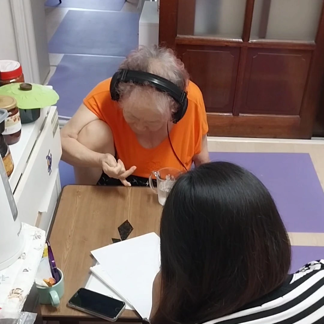 엄마는 딸이 돈을 더 받는다는 소리에 물러앉으려던 밥상에 가까이 다가앉는다. 청각장애인을 위한 마이크가 있는 헤드폰을 쓰셨다.