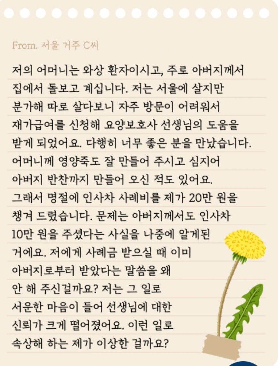 To. 요양보호사 선생님에게 감사하면서도 서운한 C씨에게