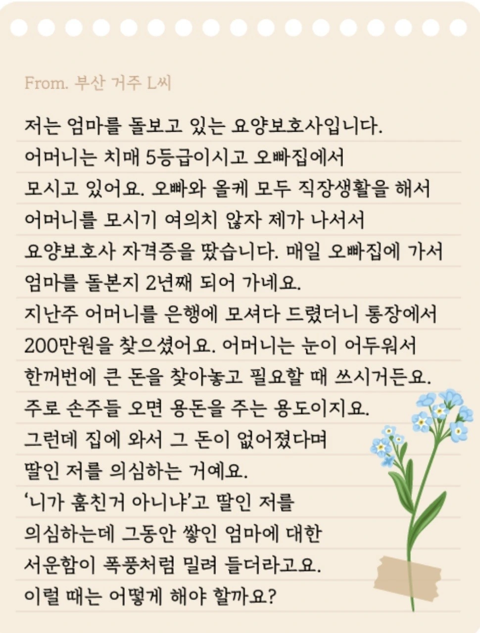 From 부산 거주 L씨 저는 엄마를 돌보고 있는 요양보호사입니다. 어머니는 치매 5등급이시고 오빠 집에서 모시고 있어요. 오빠와 올케 모두 직장생활을 해서 어머니를 모시기 여의치 않자 제가 나서서 요양보호사 자격증을 땄습니다. 매일 오빠 집에 가서 엄마를 돌본지 2년째 되어가네요. 지난주 어머니를 은행에 모셔다 드렸더니 통장에서 200만 원을 찾으셨어요. 어머니는 눈이 어두워서 한꺼번에 큰 돈을 찾아 놓고 필요할 때 쓰시거든요. 주로 손주들 오면 용돈을 주는 용도이지요. 그런데 집에 와서 그 돈이 없어졌다며 딸인 저를 의심하는 거예요. '니가 훔친 거 아니냐'고 딸인 저를 의심하는데 그동안 쌓인 엄마에 대한 서운함이 폭풍처럼 밀려 들더라고요. 이럴 때는 어떻게 해야 할까요?