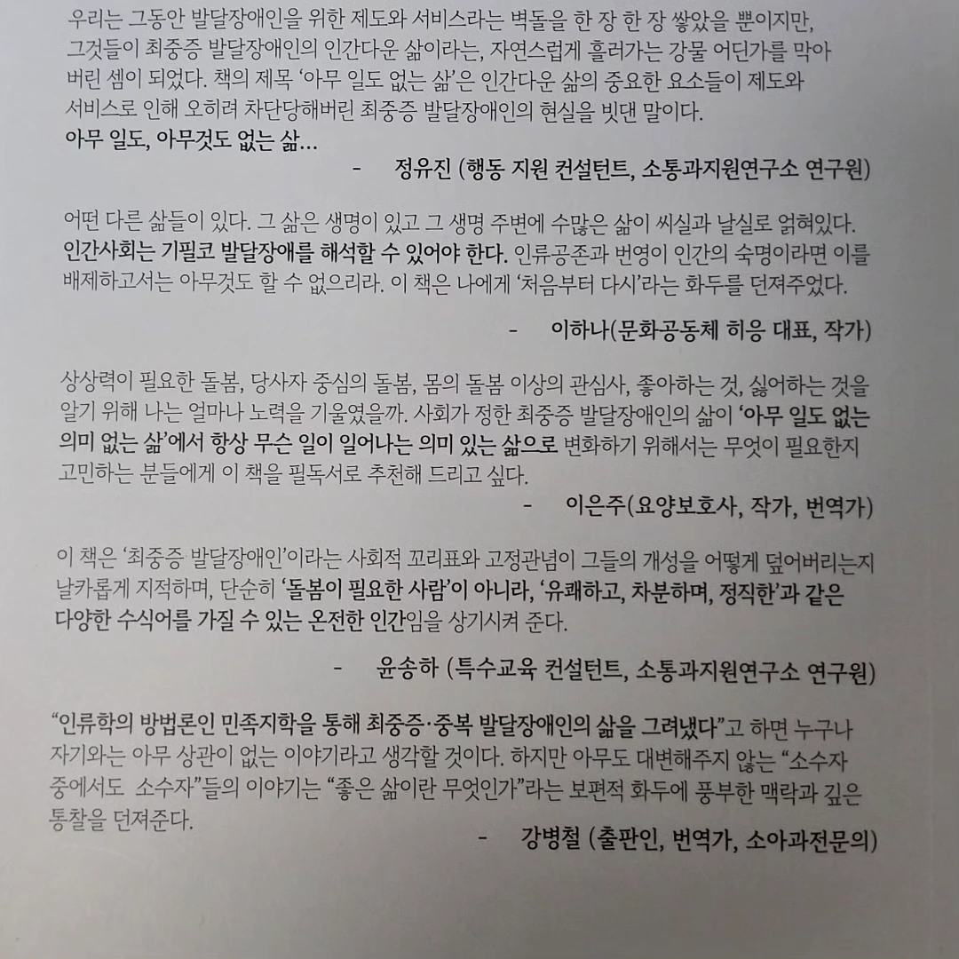 그런 생각이 더욱 구체적이고 확실하게 든 책이 바로 <아무 일도 없는 삶>이다. 이 책을 읽으면서 가장 인상적이었던 점은 ‘최중증 발달장애인’인 엘라가 야외 콘서트에 간 이야기다. 엘라를 사회적 존재로 인정하며, 그녀의 사회적 삶을 강화할 수 있는 수단을 개발하기 위해 끈질기게 노력한 그룹홈의 문화가 있어 가능한 일이었다. 엘라가 공원에서 음악을 즐겼던 그 순간은 사회적 상호작용과 소속감을 키우고 엘라가 새로운 활동, 환경 및 이벤트에 참여할 수 있도록 헌신하는 돌봄 제공자의 아름다운 동행이 있었기에 가능한 순간이기도 하다. 좋은 돌봄, 좋은 삶은 바로 이런 것이 아닐까.