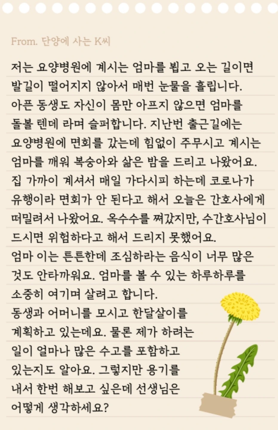 From 단양에 사는 K씨 저는 요양병원에 계시는 엄마를 뵙고 오는 길이면 발길이 떨어지지 않아서 매번 눈물을 흘립니다. 아픈 동생도 자신이 몸만 아프지 않으면 엄마를 돌볼 텐데 라며 슬퍼합니다. 지난번 출근길에는 요양병원에 면회를 갔는데 힘없이 주무시고 계시는 엄마를 깨워 복숭아와 삶은 밤을 드리고 나왔어요. 집 가까이 계셔서 매일 가다시피 하는데 코로나가 유행이라 면회가 안 된다고 해서 오늘은 간호사에게 떠밀려서 나왔어요. 옥수수를 쪄갔지만, 수간호사님이 드시면 위험하다고 해서 드리지 못했어요. 엄마 이는 튼튼한데 조심하라는 음식이 너무 많은 것도 안타까워요. 엄마를 볼 수 있는 하루하루를 소중히 여기며 살려고 합니다. 물론 제가 하려는 일이 얼마나 많은 수고를 포함하고 있는지도 알아요. 그렇지만 용기를 내서 한번 해보고 싶은데 선생님은 어떻게 생각하세요?