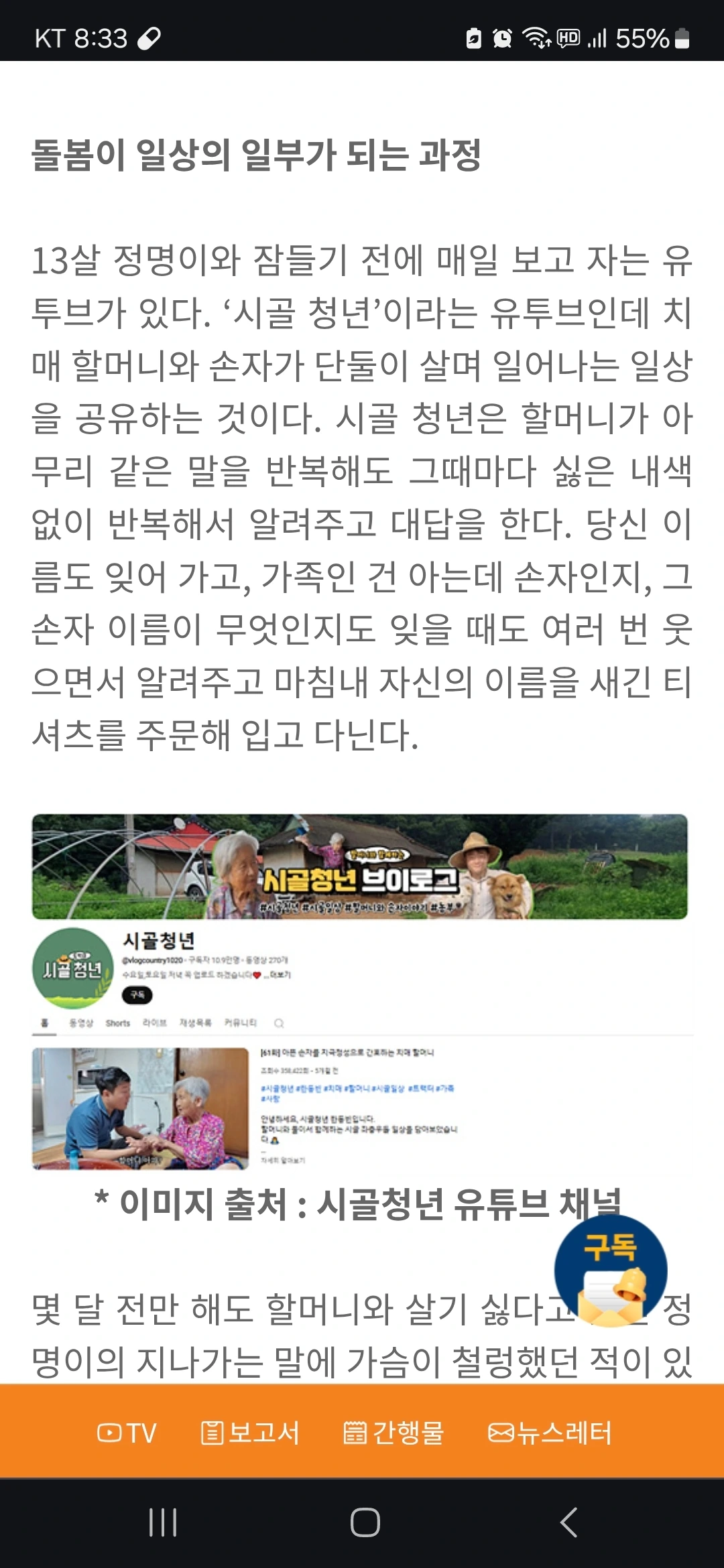 13살 정명이와 잠들기 전에 매일 보고 자는 유투브가 있다. ‘시골 청년’이라는 유투브인데 치매 할머니와 손자가 단둘이 살며 일어나는 일상을 공유하는 것이다. 시골 청년은 할머니가 아무리 같은 말을 반복해도 그때마다 싫은 내색 없이 반복해서 알려주고 대답을 한다. 당신 이름도 잊어 가고, 가족인 건 아는데 손자인지, 그 손자 이름이 무엇인지도 잊을 때도 여러 번 웃으면서 알려주고 마침내 자신의 이름을 새긴 티셔츠를 주문해 입고 다닌다.