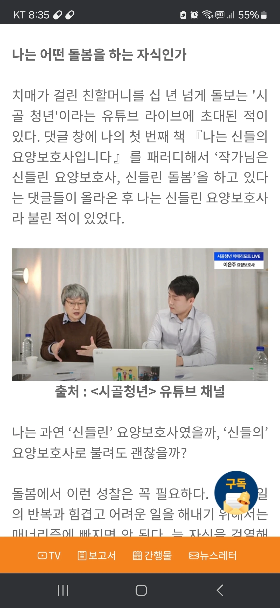 몇 달 전만 해도 할머니와 살기 싫다고 했던 정명이의 지나가는 말에 가슴이 철렁했던 적이 있었다. 사춘기에 접어든 아이가 할머니가 있는 집에 오기 싫어서 밖에서 놀다 오면 어떻게 하나와 같은 걱정을 했었다. 그러나 그것은 기우였다. 정명이에게서 변화가 일어났다. ‘시골 청년’을 본 정명이가 할머니와 소통하는 법을 깨우친 것이다. 할머니를 웃게 하려고 할머니 앞에서 춤을 추기도 하고, 침대에 누워 있는 할머니에게 뽀뽀를 해주며 스킨십을 해드리기도 하고, 밥을 안 드시겠다고 하면 정명이가 할머니에게 밥을 먹여드린다. 그러면 손자는 예뻐하니까 금방 안 드시겠다던 말을 잊고 식사를 다 하시는 것이다. 우리는 매일 시골청년 유투브를 보고 돌봄을 학습한다.