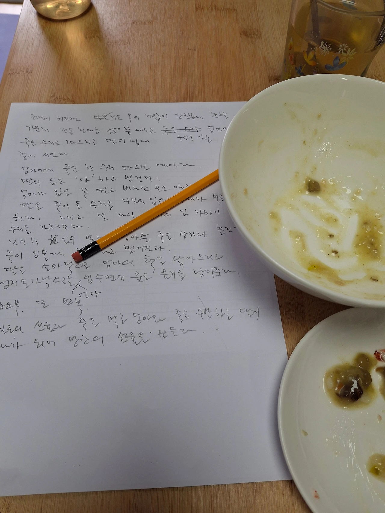 엄마에게 죽을 한 수저 떠드릴 때마다 딸은 자신의 입도 '아' 하고 벌린다. 입을 꼭 다물고 바라만 보고 있자 딸은 죽이든 수저를 자신의 입으로 가져가서 먹는 시늉을 한다. 그리고 또 다시 엄마의 입 가까이 수저를 가져간다. 간신히 입을 벌린 엄마는 죽을 삼키다 흘린다. 죽이 입술에서 턱을 타고 떨어진다.