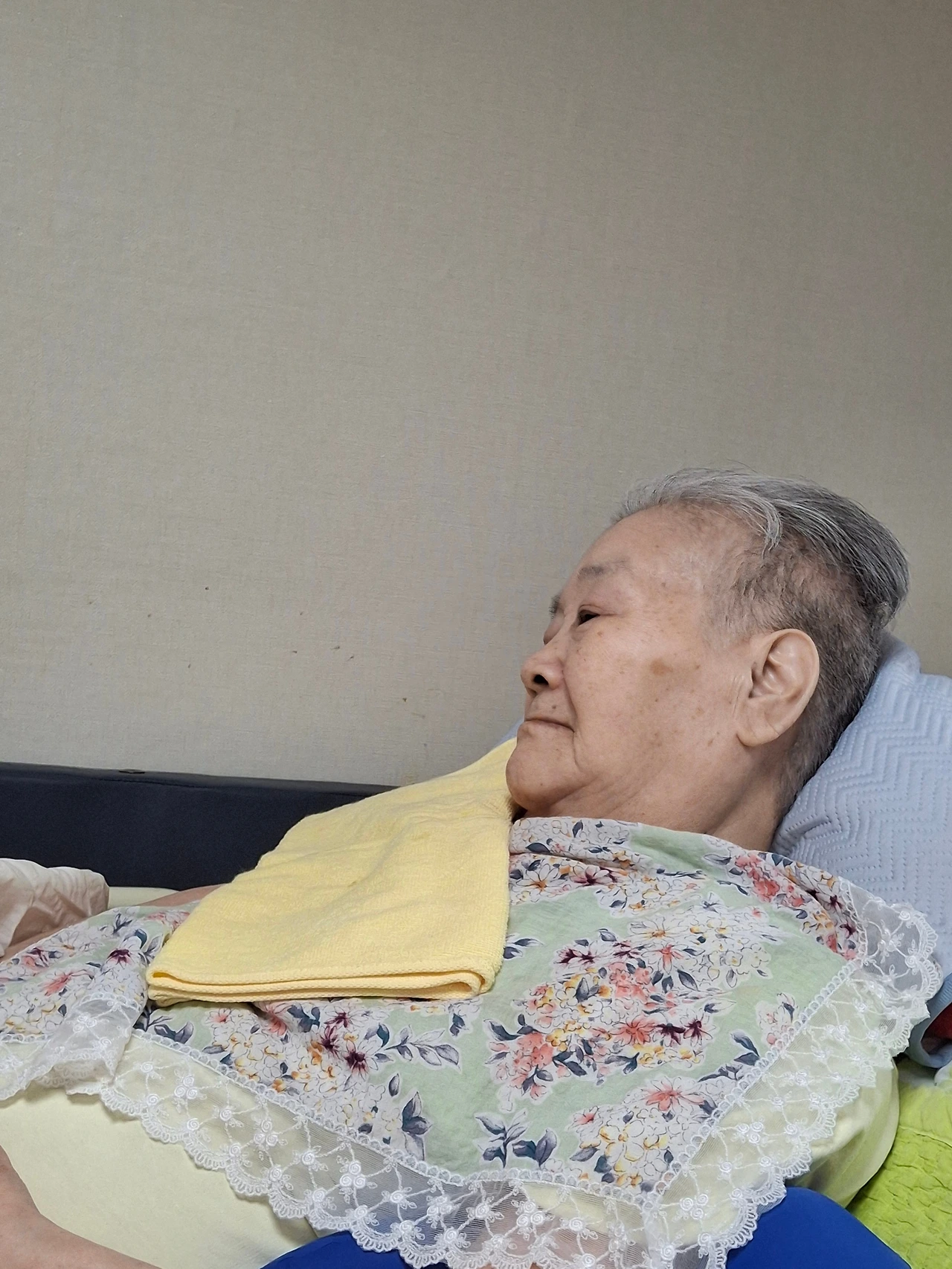 딸은 손바닥으로 엄마의 턱을 닦아 드리고, 엄지 손가락으로는 엄마의 입 주변에 묻은 물기를 닦아준다.