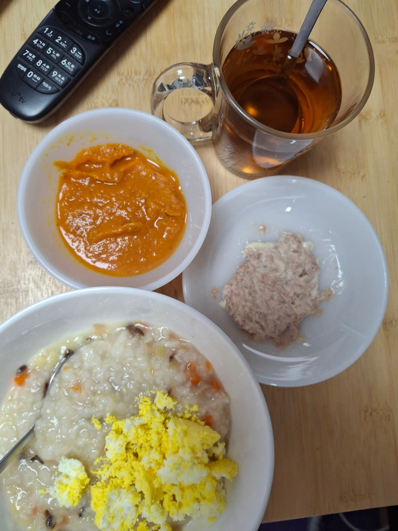 엄마의 점심으로는 삶은 달걀 한 개, 토마토 수프, 죽 한그릇 그리고 마요 참치를 드렸다. 간식은 찐 단호박 한 조각과 아주아주 소량의 수박을 드렸다.