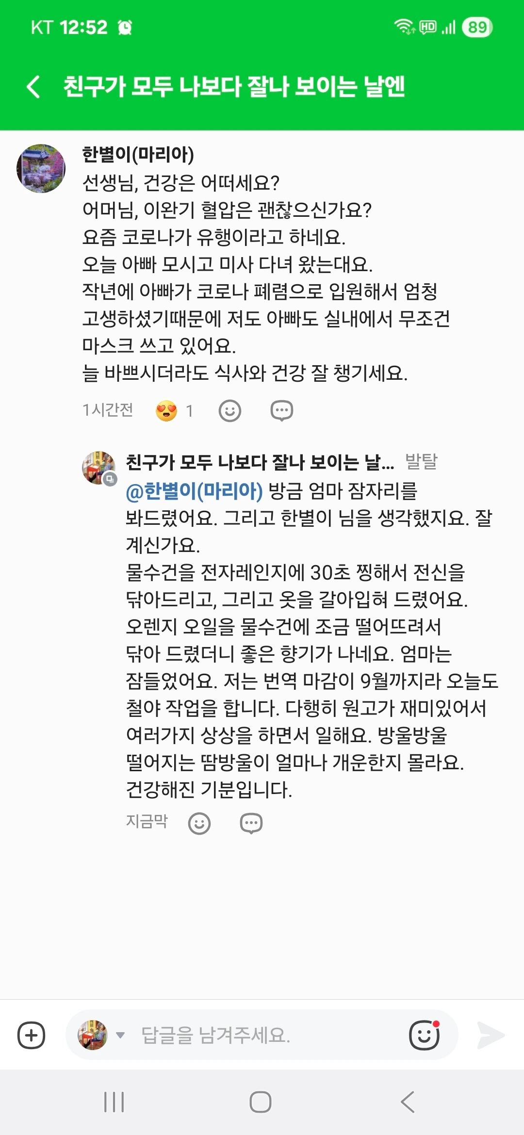 그리고 나와 같은 간병을 15년 동안 했을 한별이 님을 떠올린다. 엄마가 돌아가신 후 아버지와 단둘이 처음 맞이할 추석. 나는 그녀가 되어 그 자리에 가본다. 양은 적지만 시장에서 사온 나물이며 전이며 잡채를 상 위에 차려놓고 식사 기도를 하는 그녀가 보인다. 그들 위로 성모 마리아가 보낸 천사가 축복의 금가루, 은가루를 뿌리는 상상을 한다. 아름다운 추석이 될 것이다. 왜냐하면 엄마의 유언이 '내 몫까지 잘 살아주렴'이었으니까.