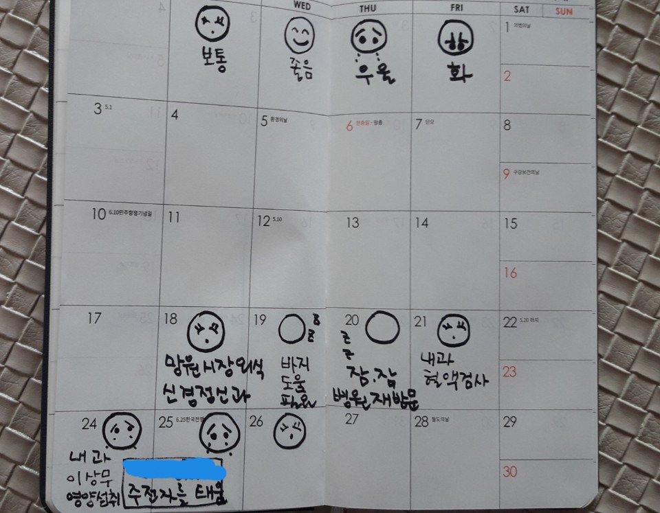 뮤즈의 우울이 약 때문인지, 일상에서 생긴 감정의 변화인지 잘은 모르지만 어쨌든 감정표를 작성하여 표시해두었다. 신경정신과 상담 시 제출하기 위해서..